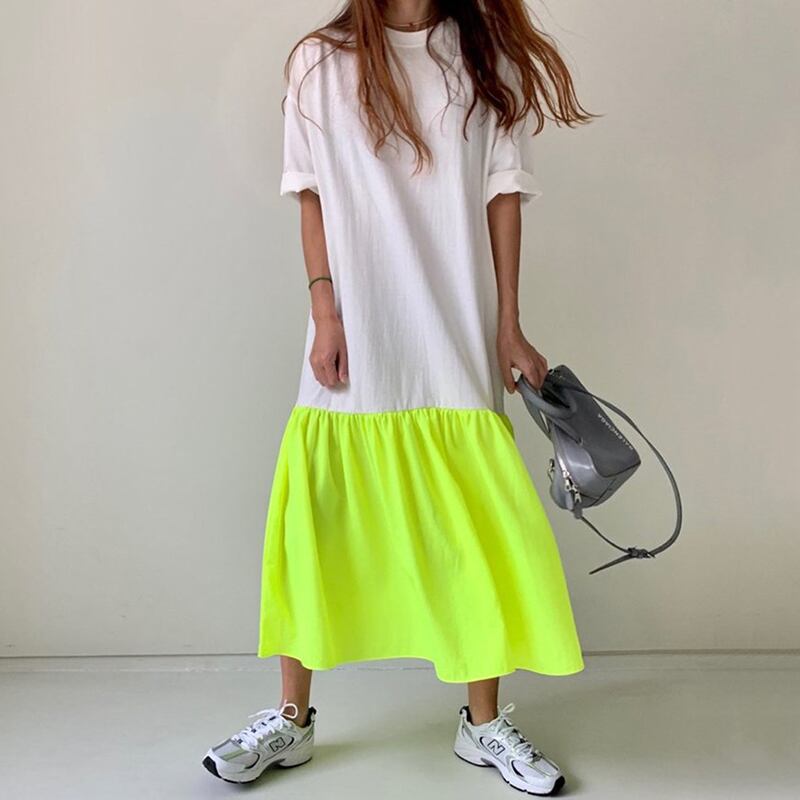 カラフルなフレアシルエットのスカート切り替えTシャツワンピース。