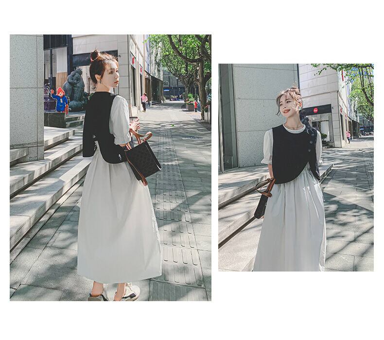 ギャザーとフレアシルエットの女性らしいデザインのロングワンピースと、ショート丈のベストのセットアップ。