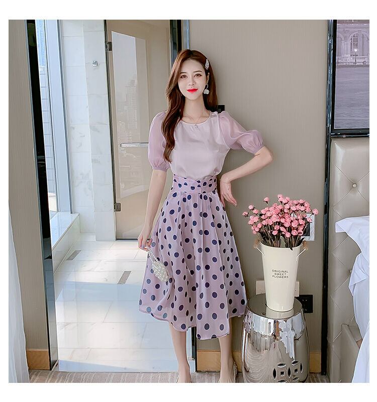 (サイズが選択可) レディース セットアップ ブラウス スカート 2点セット 上下セット シフォンブラウス ラウンドネック 半袖 パフスリーブ ロングスカート ロング丈 水玉柄 フレアスカート Aラインスカート トップス ボトムス シフォン 可愛い きれいめ シンプル カジュアル 大人 かわいい おしゃれ お洒落 上品 フェミニン 大人可愛い 大人女子 春 夏 10代 20代 30代 40代 デート お出かけ 女子会 デイリー 普段着 パーティー フォーマル 結婚式 二次会 | Chère