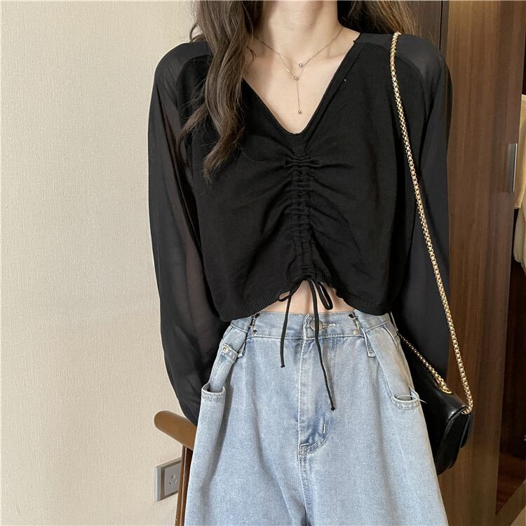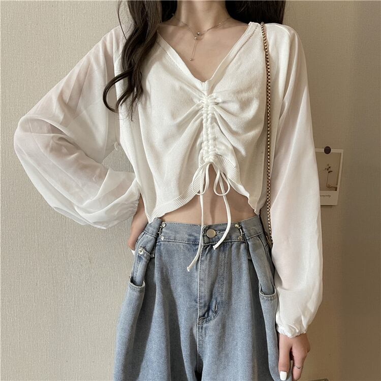 (4色選択可) レディース トップス Tシャツ ニットTシャツ フロントギャザー 胸元ギャザー ショート丈 Vネック 長袖 薄手 無地 ゆったり 日焼け対策 紫外線対策 可愛い きれいめ シンプル カジュアル 大人 かわいい おしゃれ お洒落 上品 大人可愛い 大人女子 ファッション コーディネート 春 夏 秋 10代 20代 30代 デート お出かけ 女子会 デイリー 普段着 ベージュ ホワイト 白色 ブラック 黒色 ピンク | Chère