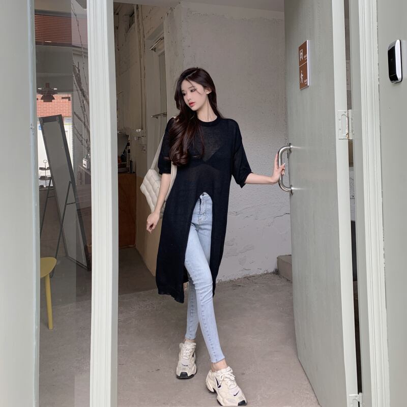 (2色選択可) トップス ニットソー ロング丈 7分袖 ラウンドネック タイト スリット ニット かわいい 大人可愛い シンプル カジュアル 大人 おしゃれ お洒落 かっこいい 大人女子 こなれ感 個性的 クール モード系 セクシー 主役級 存在感 とろみ感 透け感 無地 春 夏 秋 10代 20代 学生 デート お出かけ お泊まり 休日 旅行 高原 ガーデン 着回し 普段使い トレンド 流行 インスタ映え ホワイト ブラック | Chère