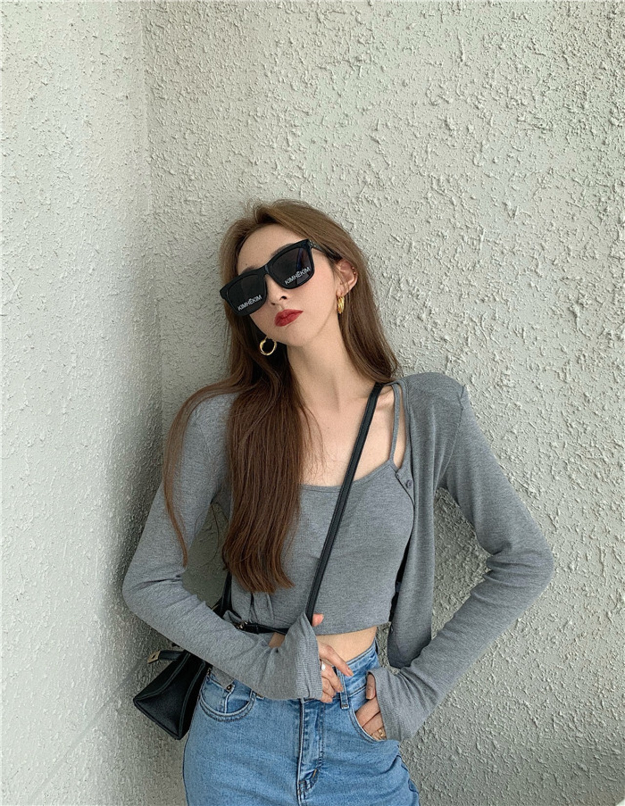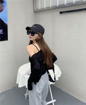 丈の短いキャミソールで、セクシーに着こなしができますね。