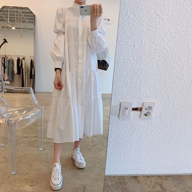(2色選択可) ワンピース シャツワンピース ティアードワンピース ロングワンピース Aラインワンピース フレアワンピース ロング丈 ミモレ丈 スタンドカラー 立ち襟 長袖 パフスリーブ 無地 ゆったり 体型カバー レディース 可愛い きれいめ シンプル カジュアル 大人 かわいい おしゃれ お洒落 上品 エレガント 大人可愛い 大人女子 フェミニン 春 夏 秋 10代 20代 30代 40代 デート お出かけ 女子会 デイリー 普段着 ホワイト 白色 ブラック 黒色 | Chère