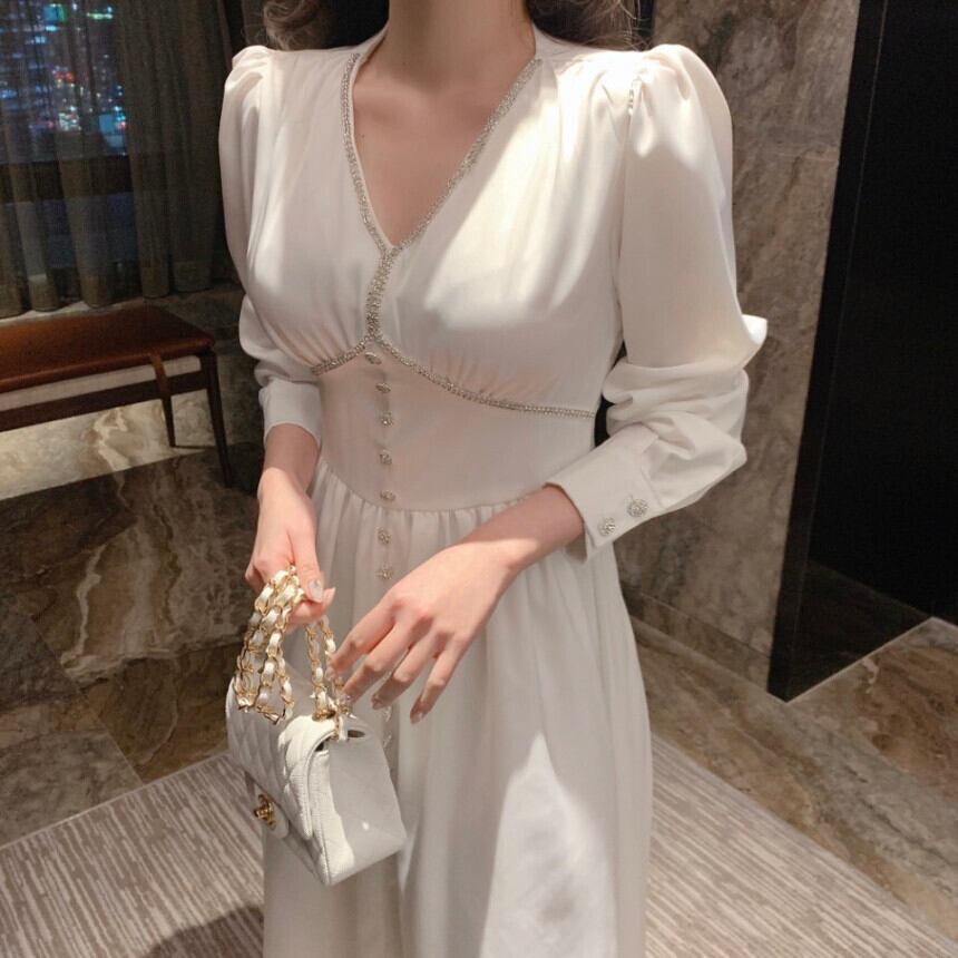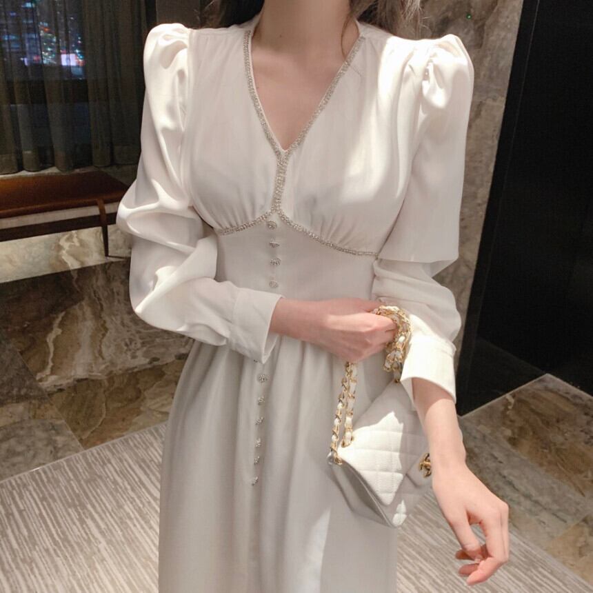 (サイズが選択可) ワンピース ロングワンピース Aラインワンピース フレアワンピース ロング丈 ミモレ丈 Vネック 長袖 パフスリーブ ウエストマーク ギャザー 無地 レディース 可愛い きれいめ シンプル カジュアル 大人 かわいい おしゃれ お洒落 上品 エレガント 大人可愛い 大人女子 フェミニン 春 秋 10代 20代 30代 40代 デート お出かけ 女子会 デイリー 普段着 パーティー ホワイト 白色 | Chère