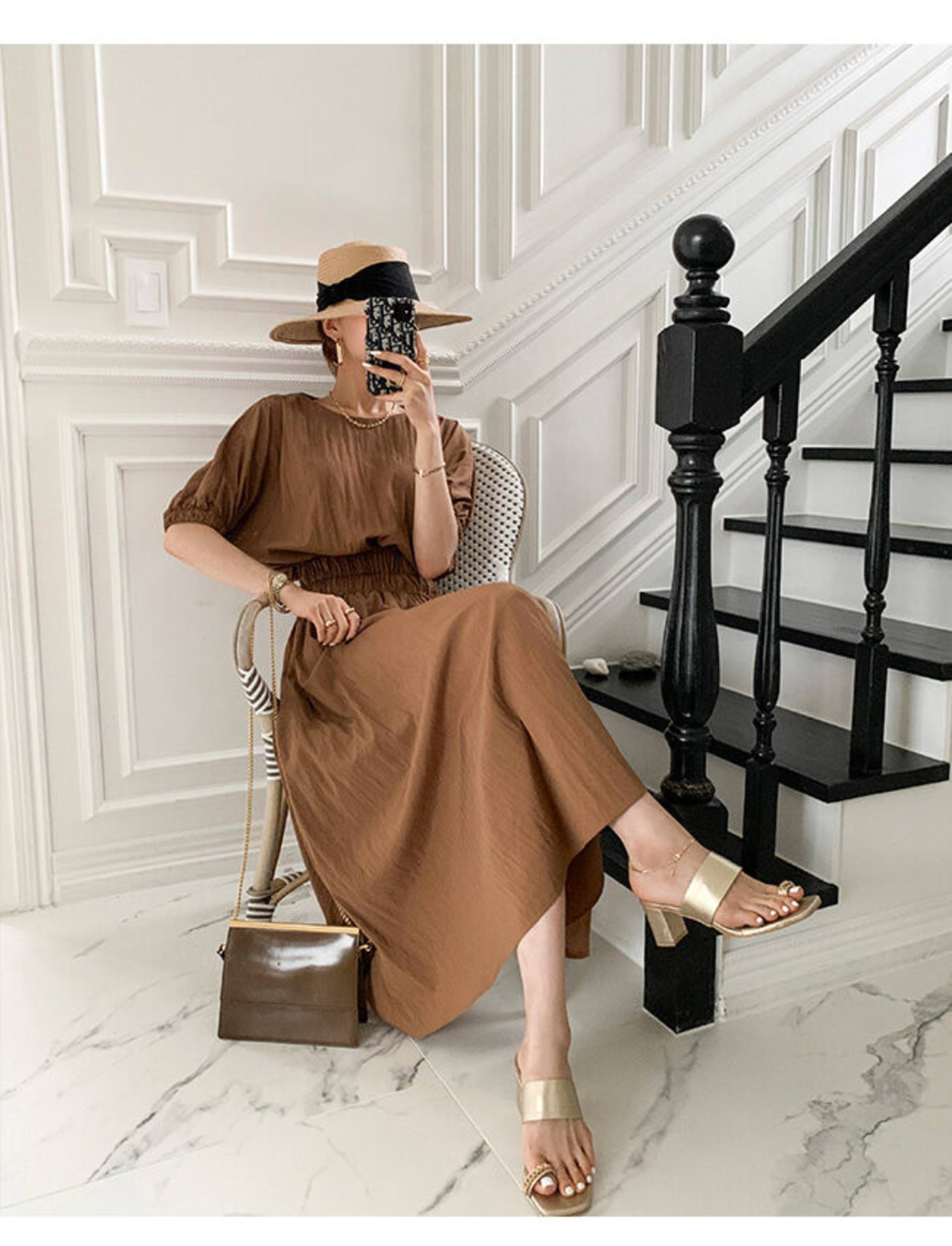 (2色選択可) ワンピース ロングワンピース Aラインワンピース フレアワンピース ロング丈 マキシ丈 ラウンドネック 半袖 パフスリーブ ウエストギャザー ウエストゴム シャーリング ゆったり 体型カバー 無地 レディース 可愛い きれいめ シンプル カジュアル 大人 かわいい おしゃれ お洒落 上品 エレガント 大人可愛い 大人女子 春 夏 10代 20代 30代 40代 デート お出かけ 女子会 デイリー 普段着 通勤 OL オフィス パーティー ベージュ カーキ | Chère