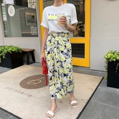 鮮やかな花柄にバックスリット入りのスラリとした上品なシルエットのロングスカート。