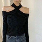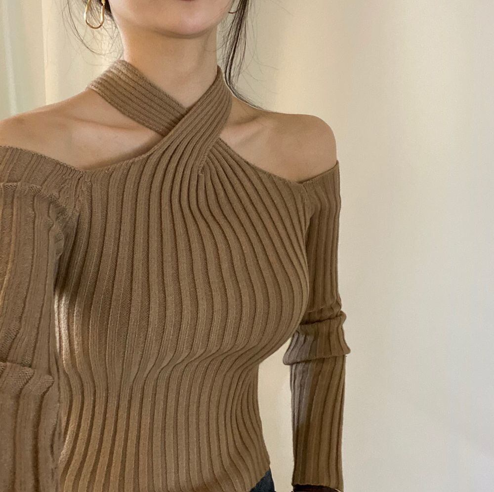 ネックラインを大胆にクロスさせたデザインがモードな印象のニットです。