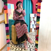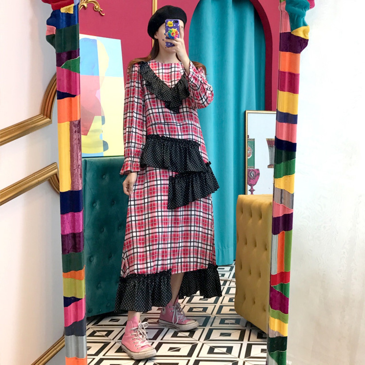 チェックとアシンメトリーのフリルが可愛いワンピースです。