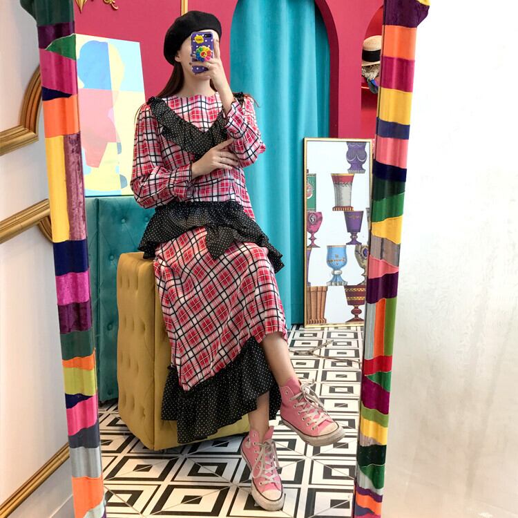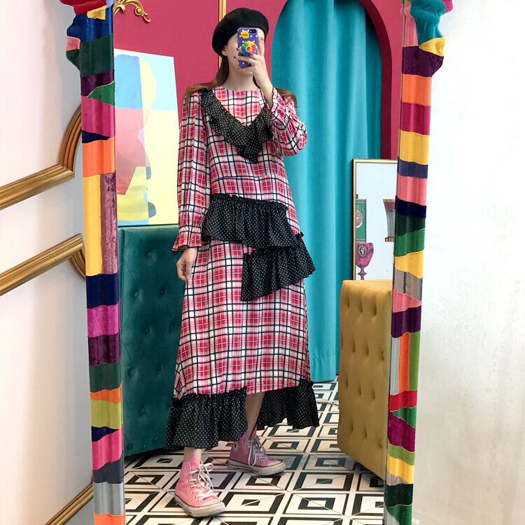 (2色選択可) ワンピース ロング丈 長袖 ラウンドネック Aライン フリル かわいい 大人可愛い カジュアル おしゃれ お洒落 大人女子 こなれ感 ラブリー キュート 主役級 存在感 チェック柄 春 秋 10代 女の子 学生 通学 デート お出かけ お泊まり 休日 旅行 普段使い 韓国系 楽ちん 体系カバー トレンド 流行 インスタ映え レッド ブルー | Chère