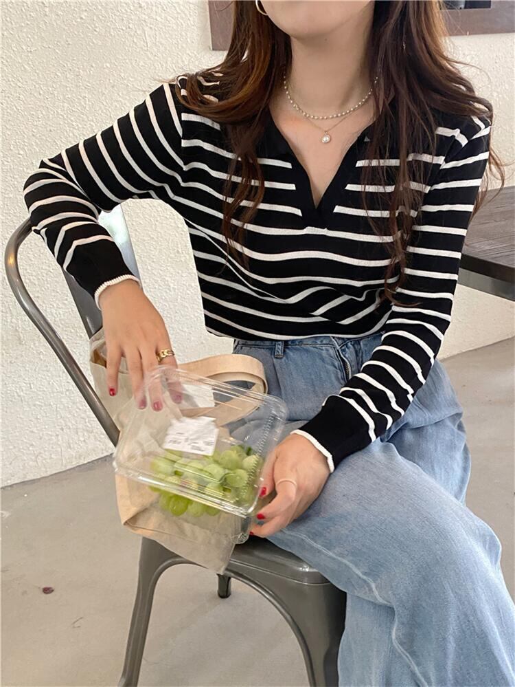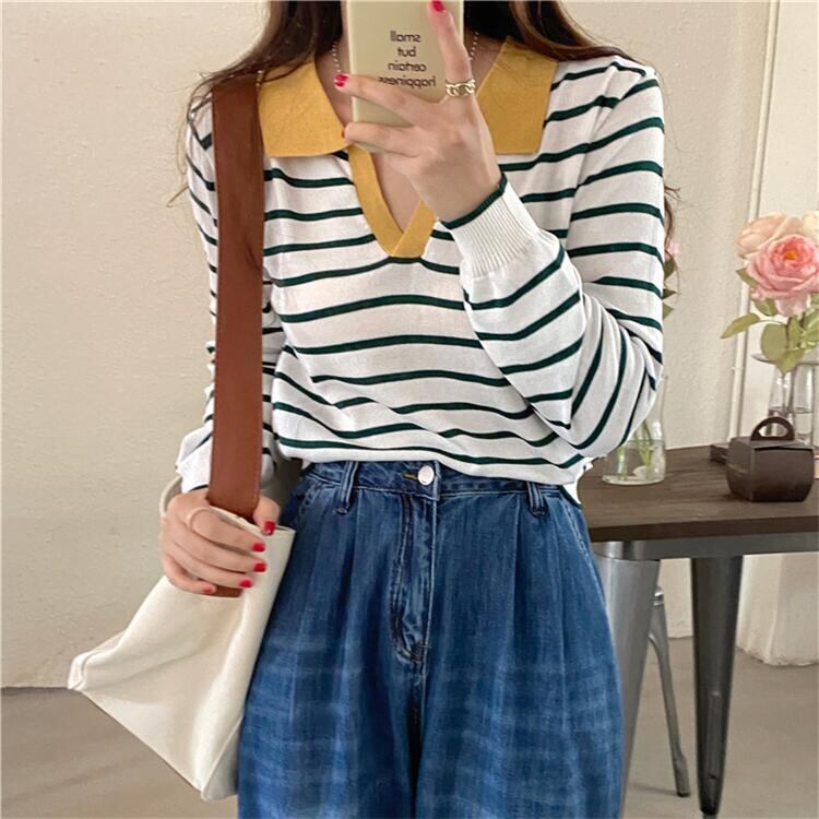 (4色選択可) トップス セーター 長袖 Vネック 襟付き 薄手 かわいい 大人可愛い カジュアル おしゃれ お洒落 レトロ 大人女子 こなれ感 ラフ 主役級 存在感 ボーダー 春 秋 冬 10代 20代 30代 通勤 学生 通学 デート お出かけ 公園デビュー お泊まり 休日 運動 リゾート 高原 ガーデン 着回し 普段使い 韓国系 トレンド 流行 インスタ映え ホワイト ブラック レッド アプリコット | Chère