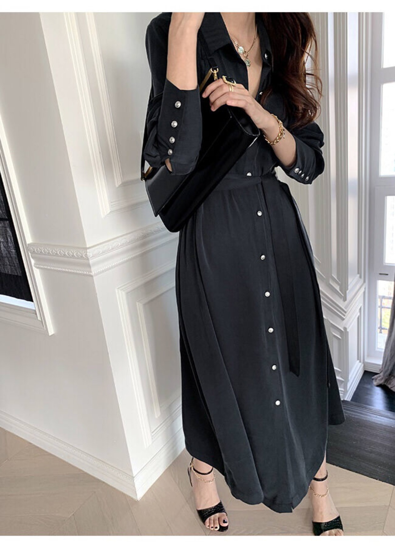 ベルトでメリハリをつければきちんと感もある、上品で大人可愛いロングシャツワンピース。