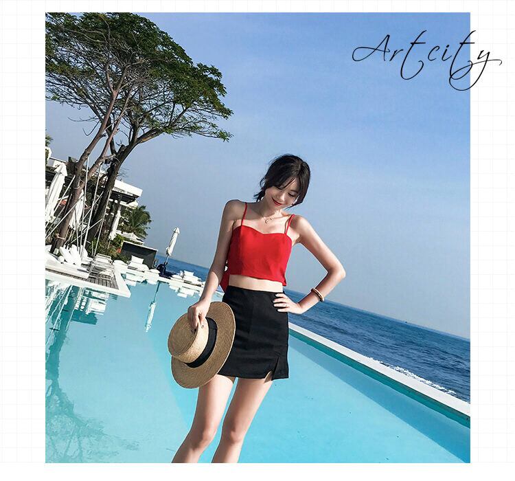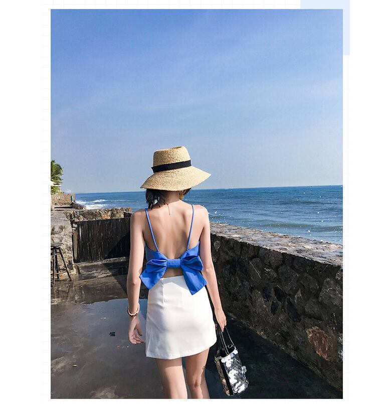 大胆な背中開きがセクシーで大きめのリボンがおしゃれで大人可愛いショート丈のキャミソール。