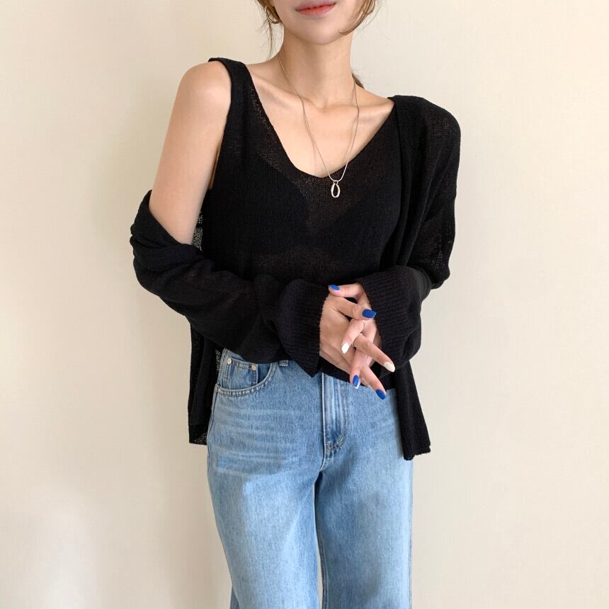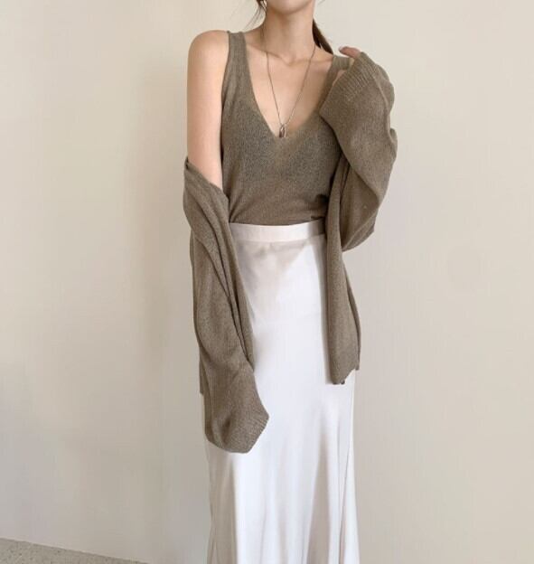 キャミソールとカーディガンのリネンニットのアンサンブル。