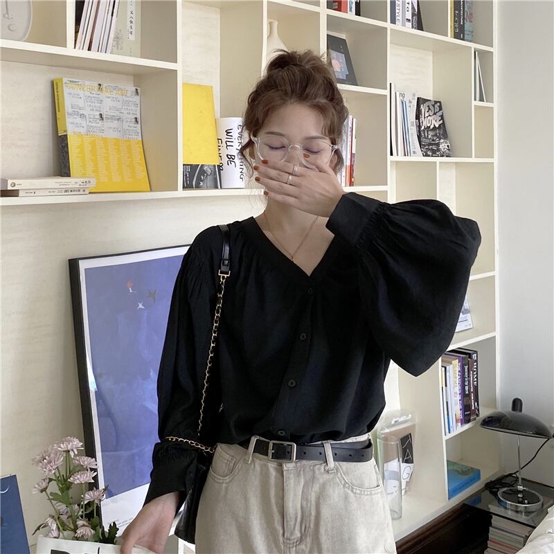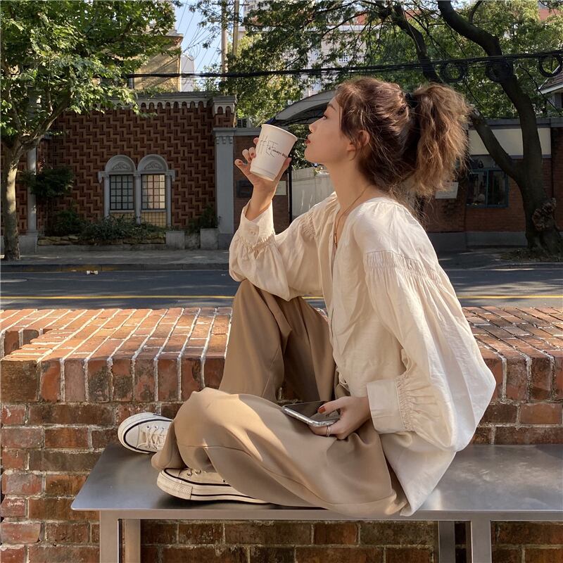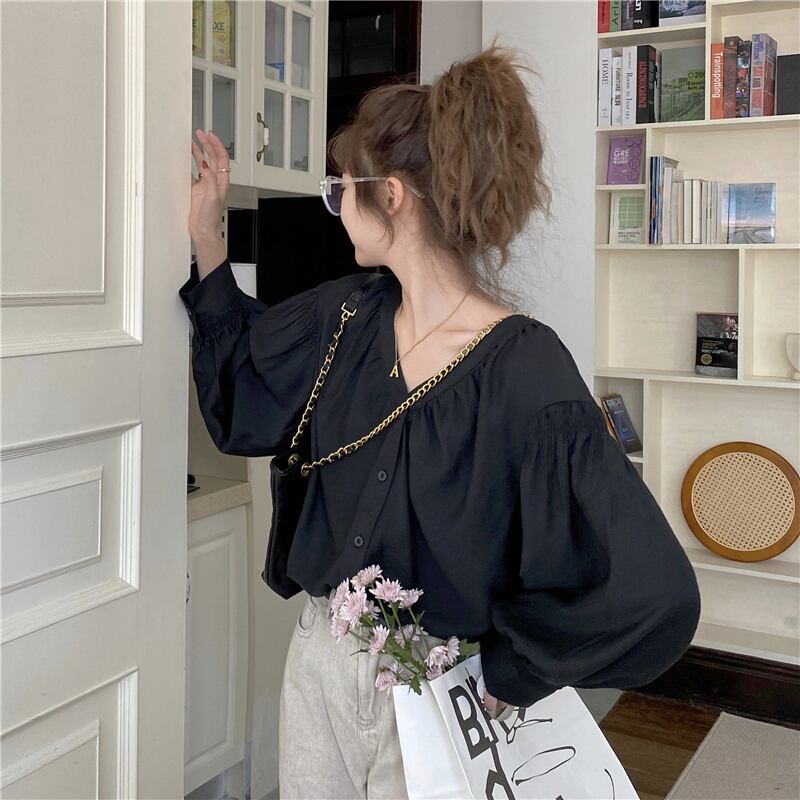 (2色選択可) トップス ブラウス 長袖 Vネック 前開き シャーリング コットン かわいい 大人可愛い カジュアル おしゃれ お洒落 大人女子 こなれ感 ラフ 個性的 主役級 存在感 無地 春 秋 10代 20代 30代 40代 通勤 学生 通学 デート お出かけ 公園デビュー お泊まり 休日 高原 ガーデン 着回し 普段使い 楽ちん 体系カバー トレンド 流行 インスタ映え ブラック アプリコット | Chère