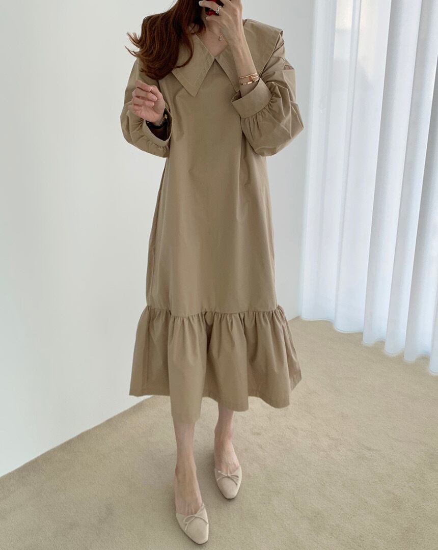 大きめの襟とふわりと広がるAラインシルエットが大人可愛いロングワンピース。