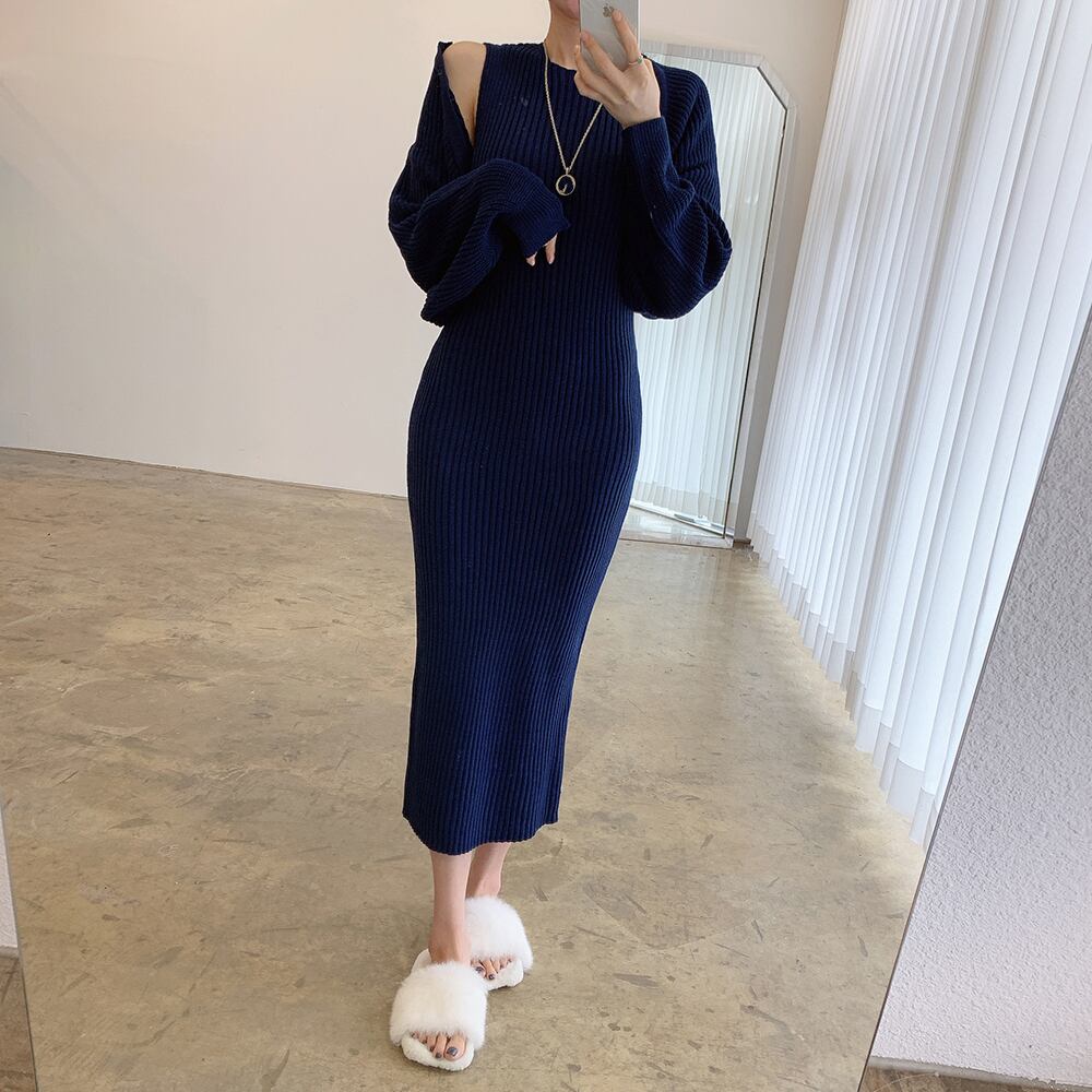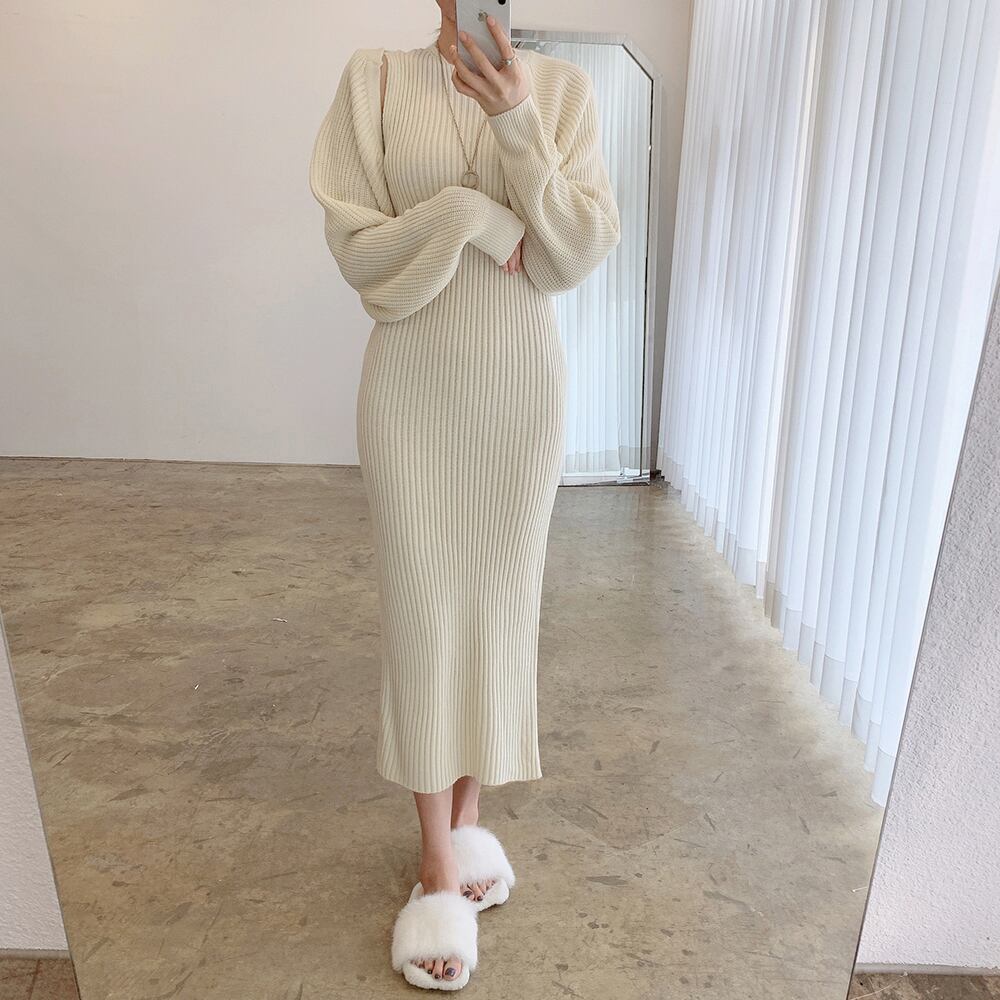 タイトなシルエットが上品でフェミニンなニットワンピースとカーディガンの2点セット。