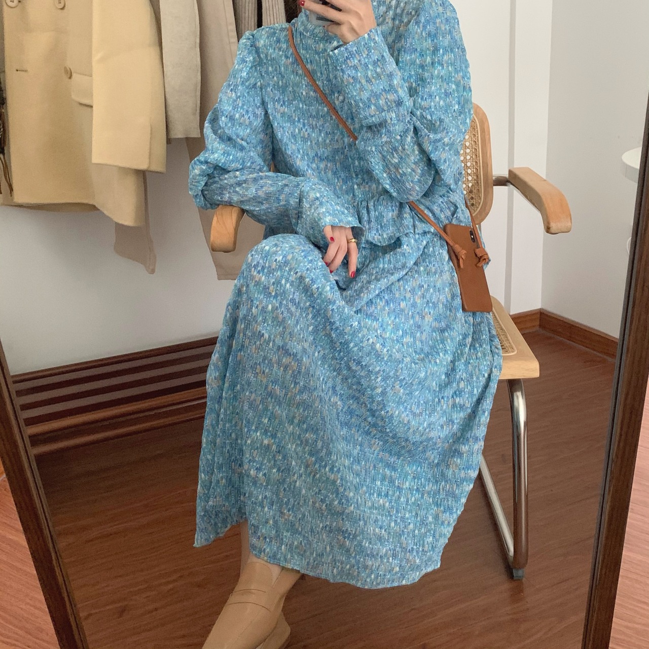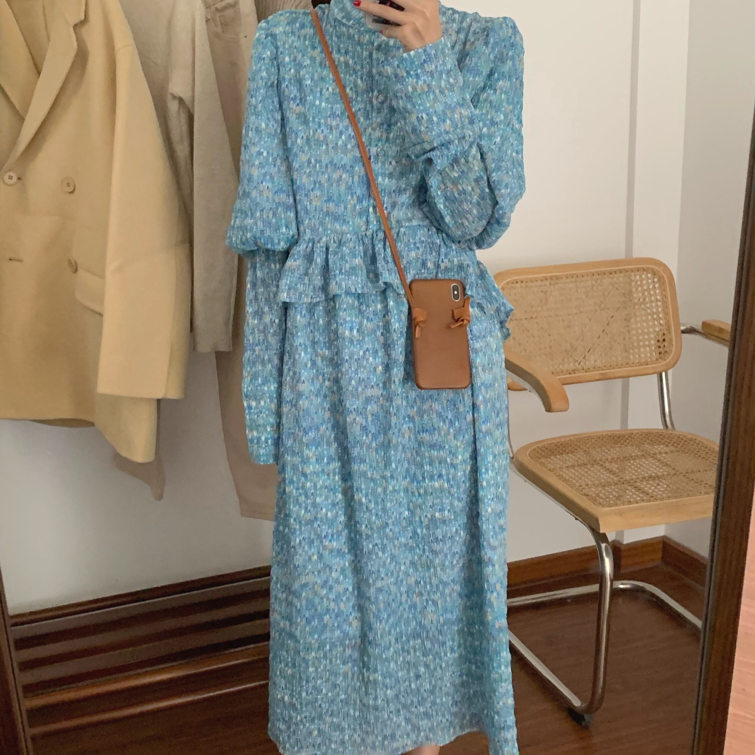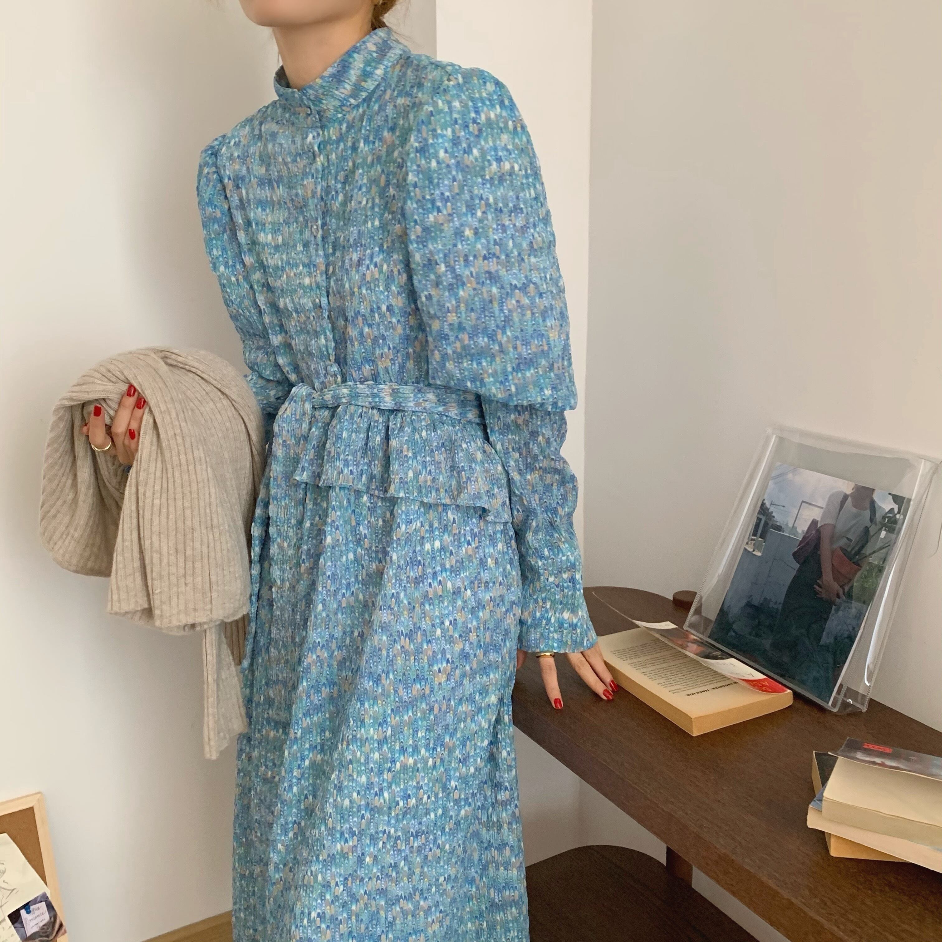 ワンピース シャツワンピース ロングワンピース Aラインワンピース フレアワンピース プリント スタンドカラー 立ち襟 長袖 フリル リボン ゆったり レディース 可愛い きれいめ シンプル カジュアル 大人 かわいい おしゃれ お洒落 上品 大人可愛い 大人女子 春 秋 冬 10代 20代 30代 40代 デート お出かけ 女子会 デイリー 普段着 ブルー 青色 | Chère