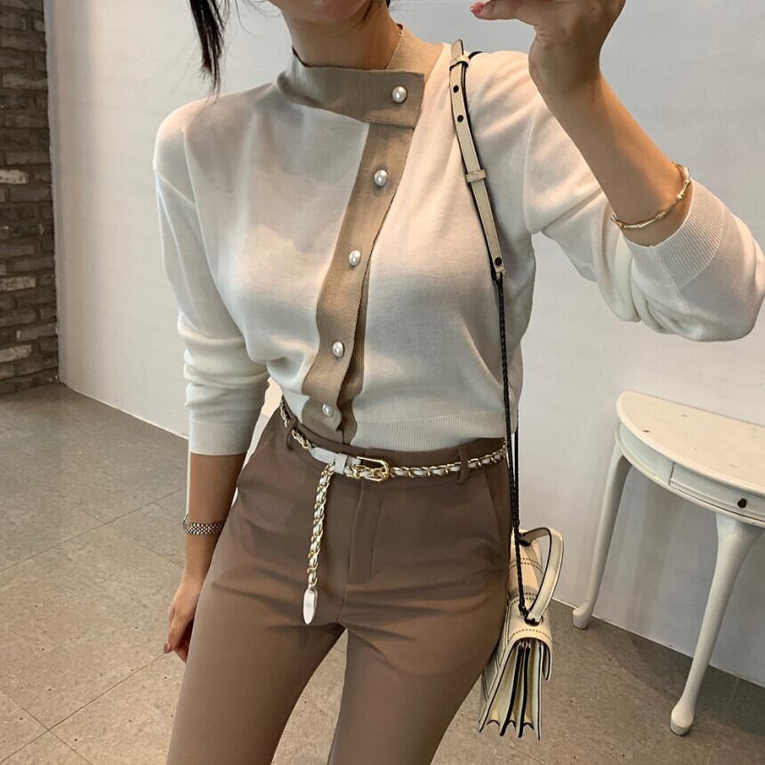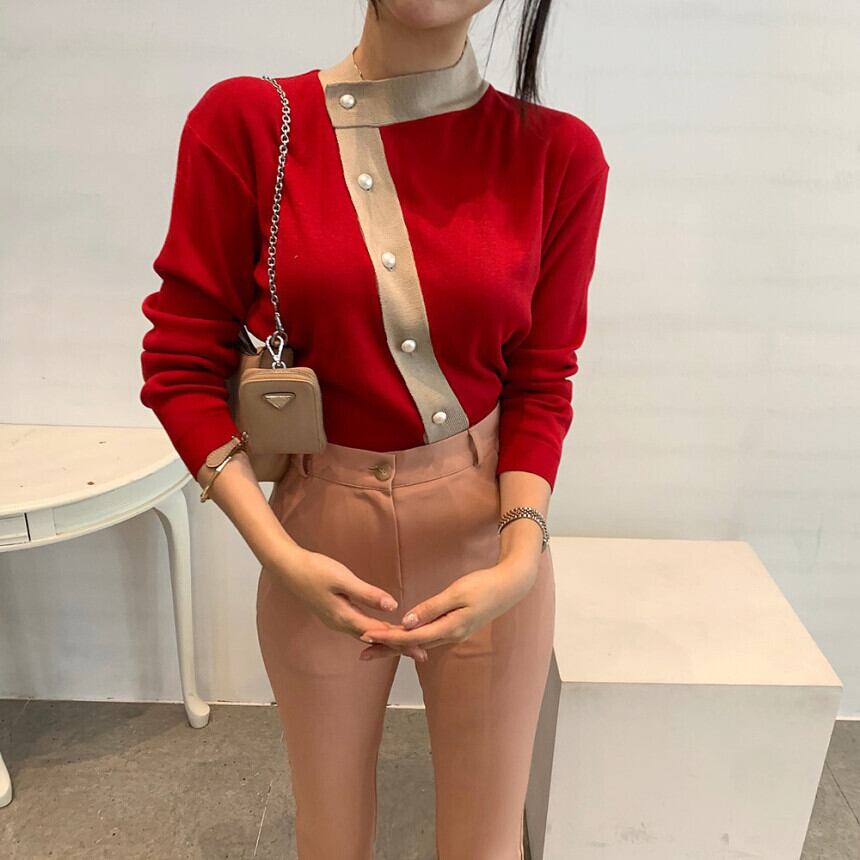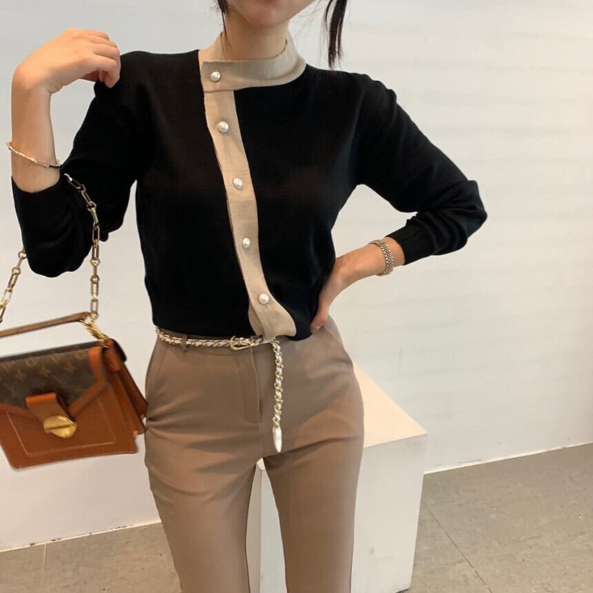(4色選択可) ニットセーター ニットカーディガン ショート丈 トップス 前開き アシンメトリー パールボタン バイカラー ラウンドネック 長袖 細身 レディース 可愛い きれいめ シンプル カジュアル 大人 かわいい おしゃれ お洒落 上品 フェミニン 大人可愛い 大人女子 春 秋 冬 10代 20代 30代 40代 デート お出かけ 女子会 通勤 OL オフィス デイリー 普段着 ベージュ ブラック 黒色 ホワイト 白色 レッド 赤色 | Chère