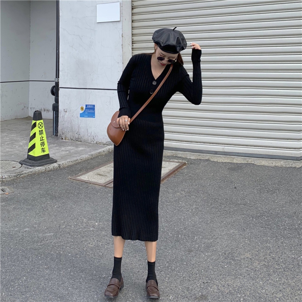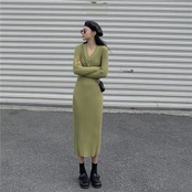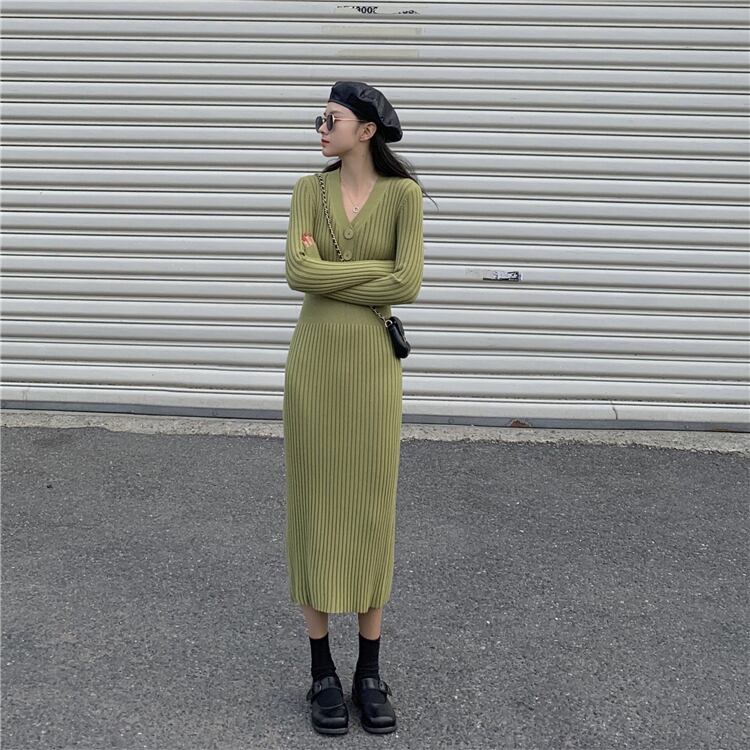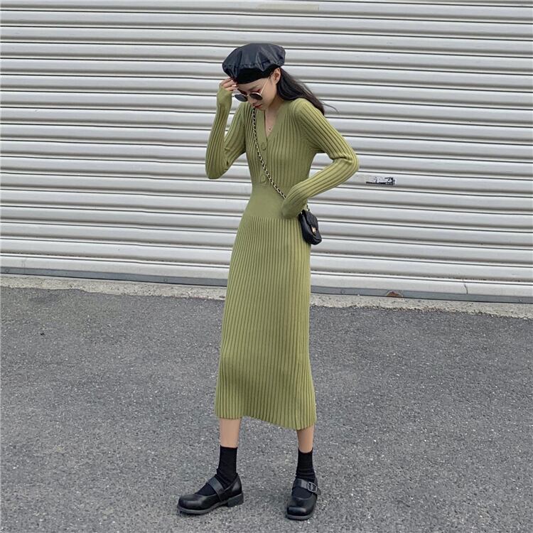 (色とサイズが選択可) ニットワンピース ロングワンピース 長袖 Vネック リブ スリム タイト シンプル かわいい カジュアル きれいめ 大人可愛い おしゃれ レトロ 大人女子 無地 10代 20代 30代 40代 休日 お出かけ デート 女子会 韓国系 ファッション モテ コーデ グリーン 緑 ブラック 黒 | Chère