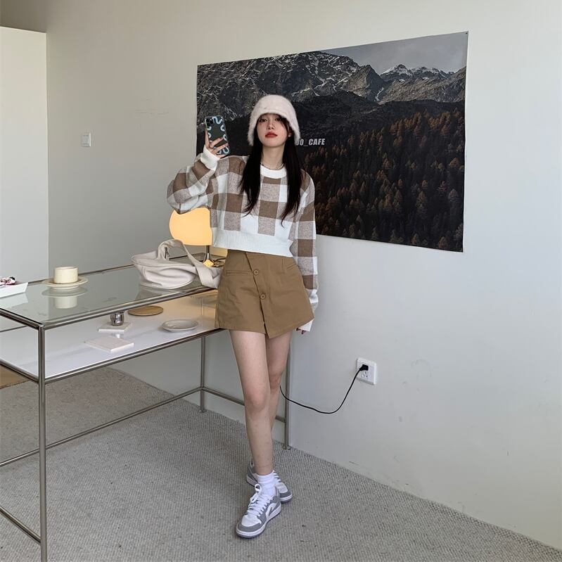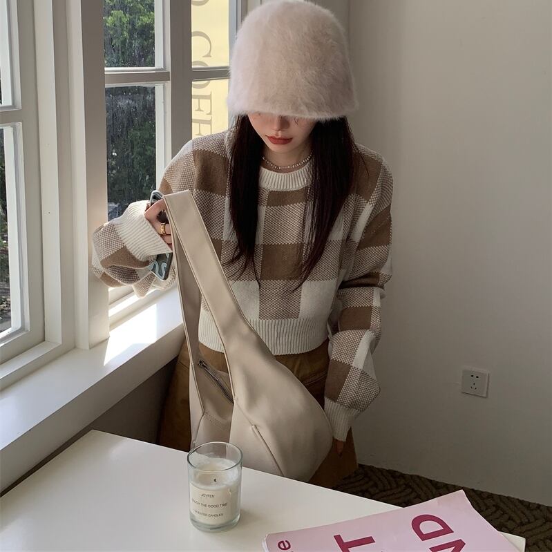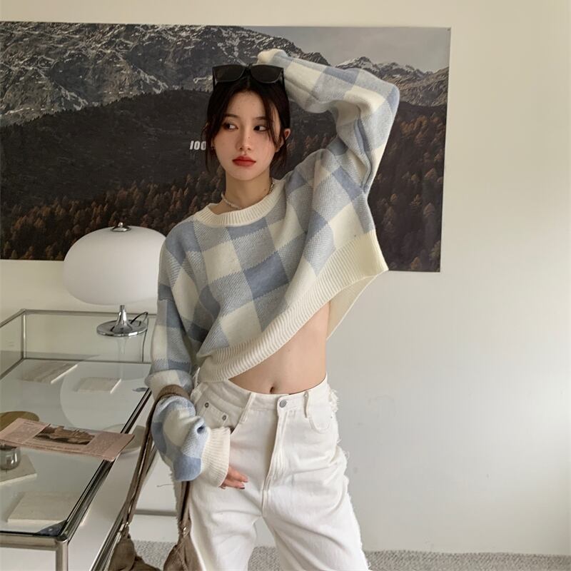 (2色選択可) トップス セーター ニットセーター チェック柄 プルオーバー 長袖 ラウンドネック ショート丈 カジュアル シンプル かわいい おしゃれ キュート ガーリー こなれ感 10代 20代 30代 40代 休日 お出かけ デート 女子会 普段使い モテ コーデ 韓国系 ファッション スタイル カーキ ブルー 青 | Chère