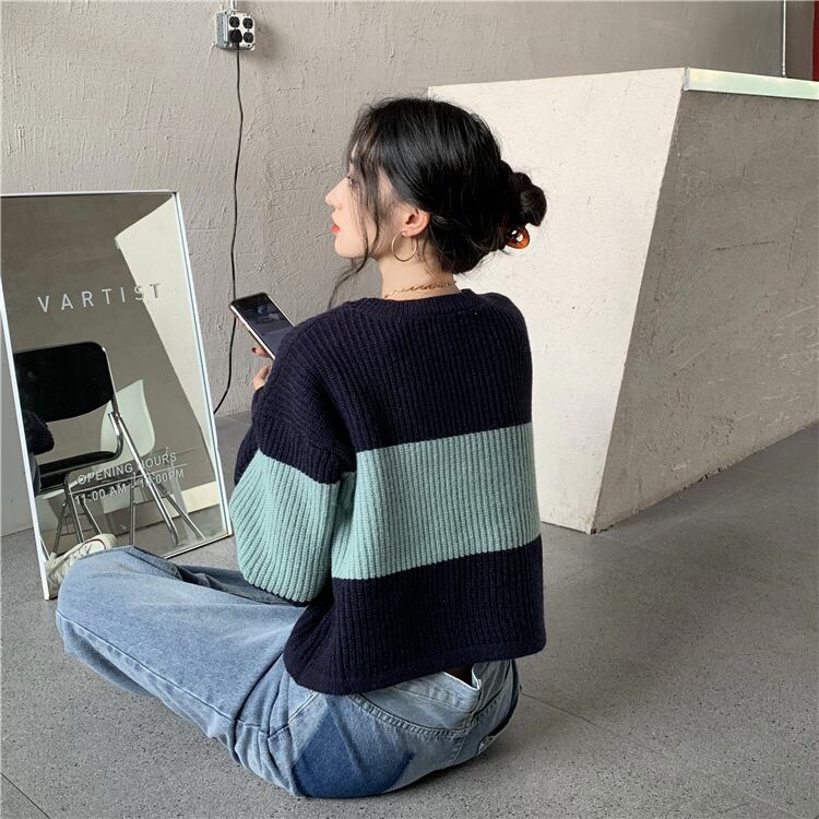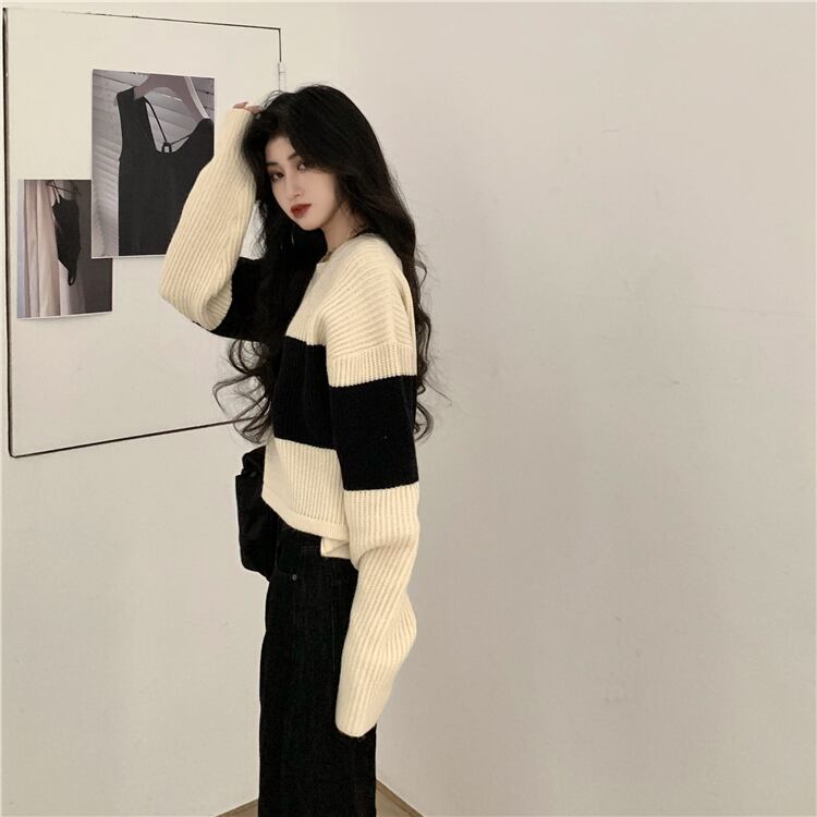 秋冬コーデの定番のバイカラーボーダー柄の大人可愛いショート丈ニットセーター。