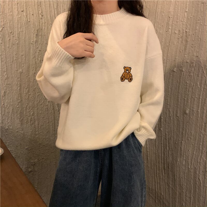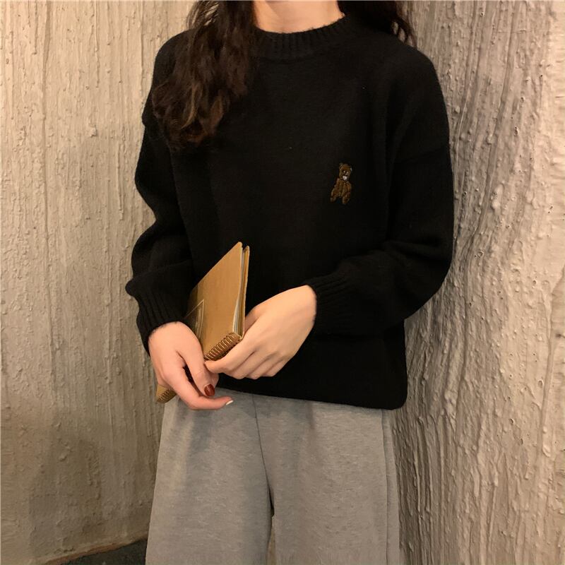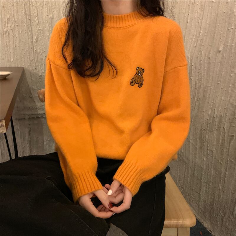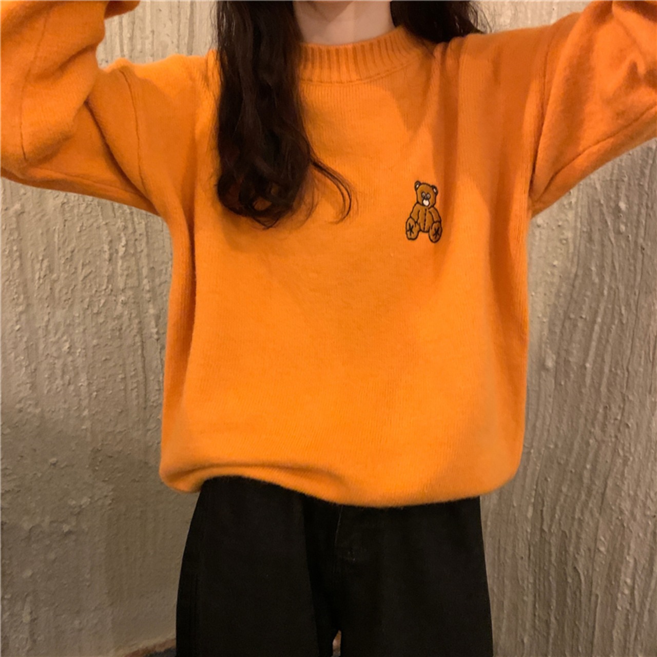 (4色選択可) トップス プルオーバー セーター ラウンドネック 袖あり 長袖 かわいい ワンポイント ふわふわ ベア フリーサイズ ゆる ゆったり 大人可愛い シンプル カジュアル 白 黒 青 オレンジ 秋 冬 春 レトロ ラフ キャラクター 10代 20代 30代 40代 部屋着 ルームウェア 学生 通学 お出かけ 公園デビュー 女子会 お泊まり 休日 着回し 普段使い 重ね着 お揃い 韓国 韓国系 オルチャン ファッション コーデ 楽ちん あったか 体系カバー トレンド 流行 インスタ映え カラバリ | Chère