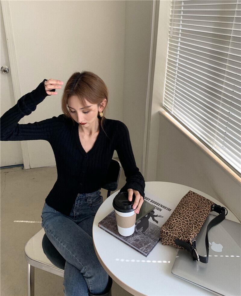 Vネックに細身デザインがスッキリ見せてくれる大人可愛いニットカーディガン。