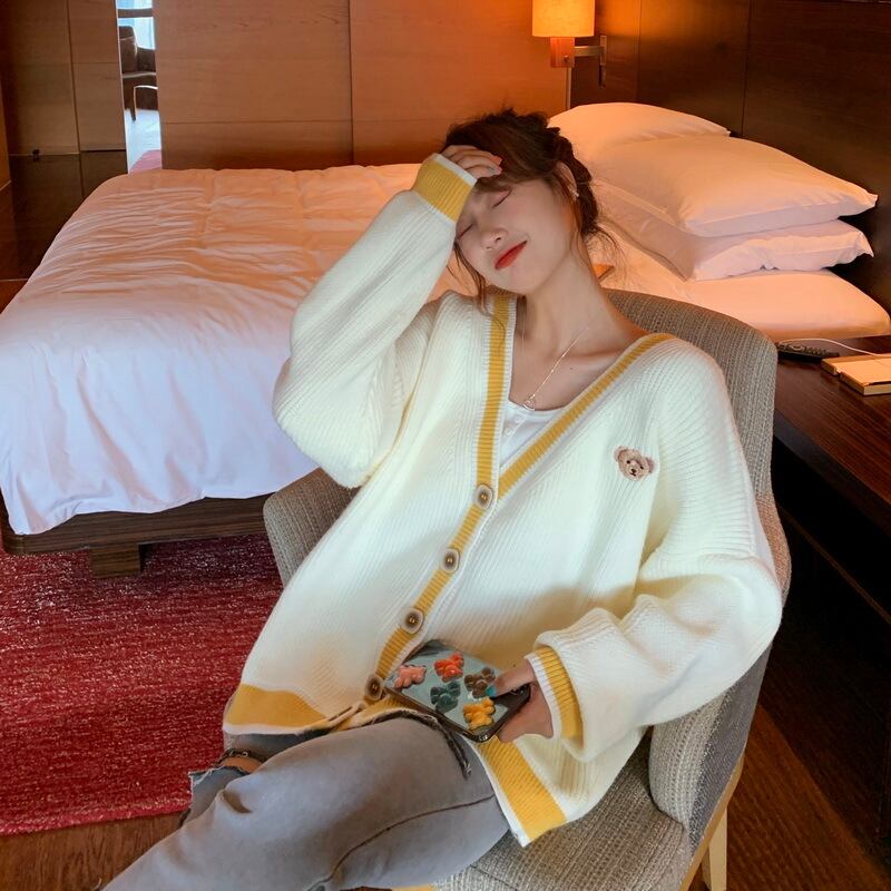 (サイズ選択可) トップス カーディガン ニットカーディガン 前開き Vネック 長袖 ボタン シングルブレスト カジュアル キュート ルーズ ガーリー かわいい おしゃれ こなれ感 10代 20代 30代 40代 女子会 休日 お出かけ オフホワイト 白 韓国系 ファッション スタイル コーデ | Chère