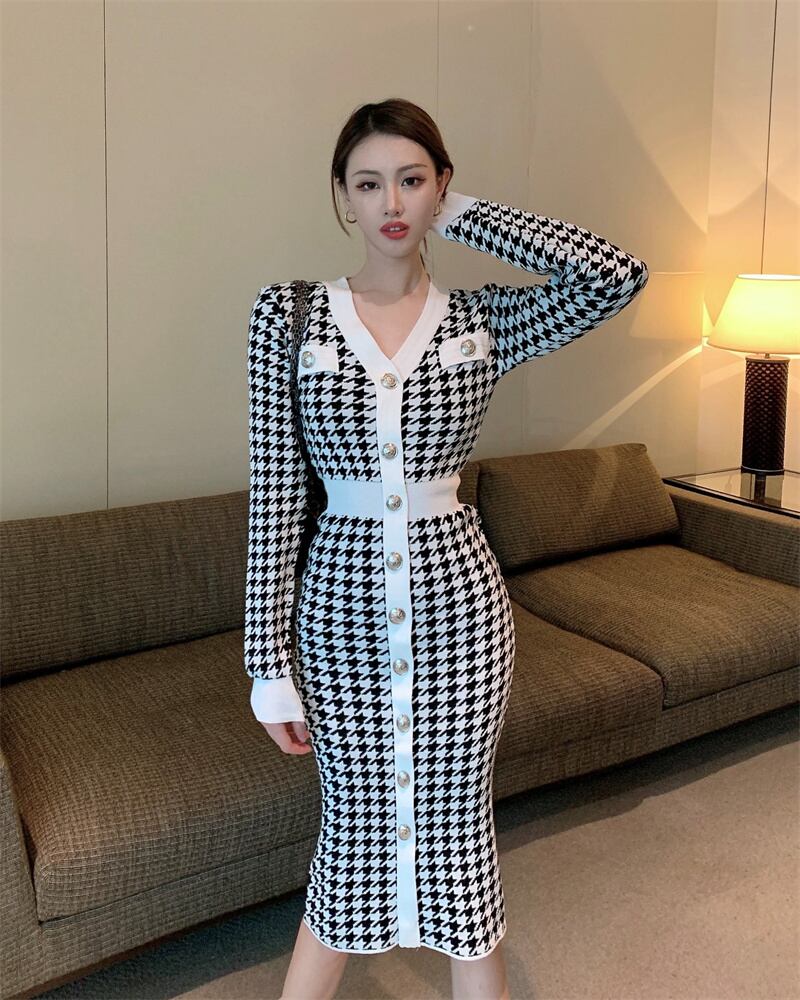 ワンピース ニットワンピース チェック柄 タイトワンピース ロングワンピース ロング丈 ミモレ丈 Vネック 長袖 細身 スリム レディース 可愛い きれいめ シンプル カジュアル 大人 かわいい おしゃれ お洒落 上品 フェミニン 大人可愛い 大人女子 春 秋 冬 10代 20代 30代 40代 デート お出かけ 女子会 通勤 OL オフィス フォーマル デイリー 普段着 | Chère
