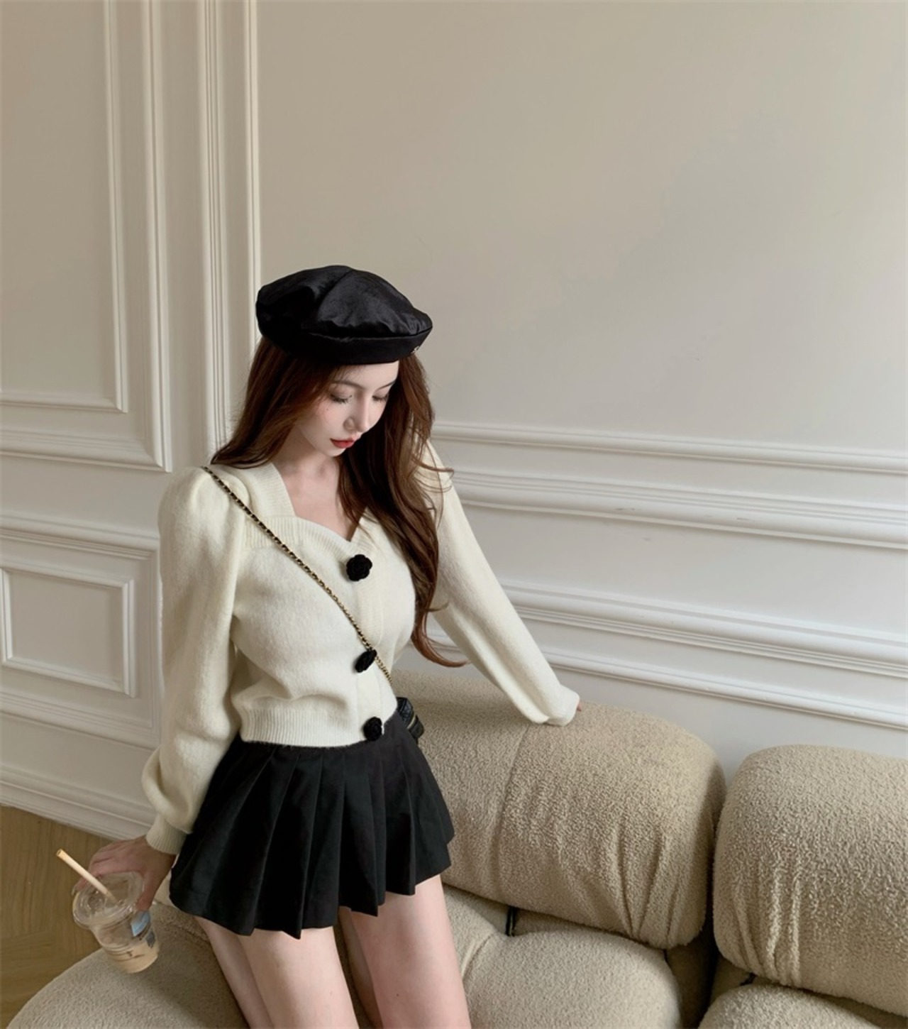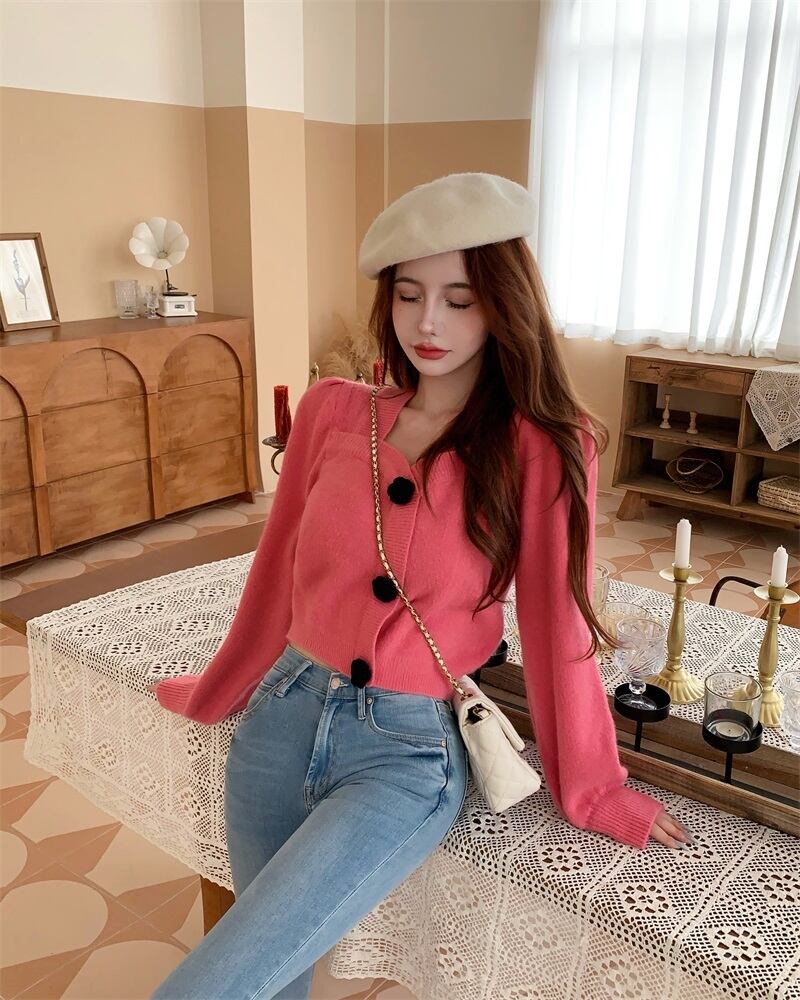パフスリーブにハートネックデザインがフェミニンで大人可愛いニットカーディガン。