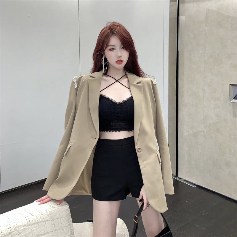 肩のダイヤビジューがアクセントの上品で大人可愛いテーラードジャケット。
