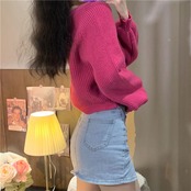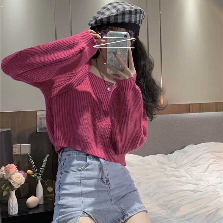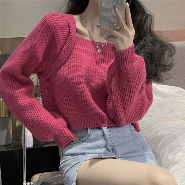 パフスリーブ×スクエアネックの組み合わせがキュートなニットセーター。
