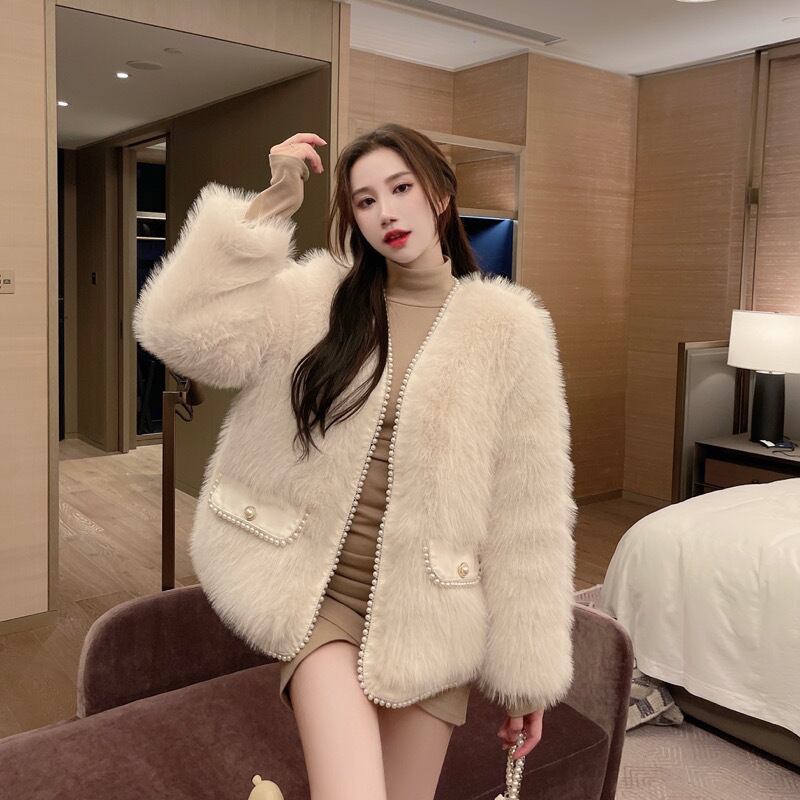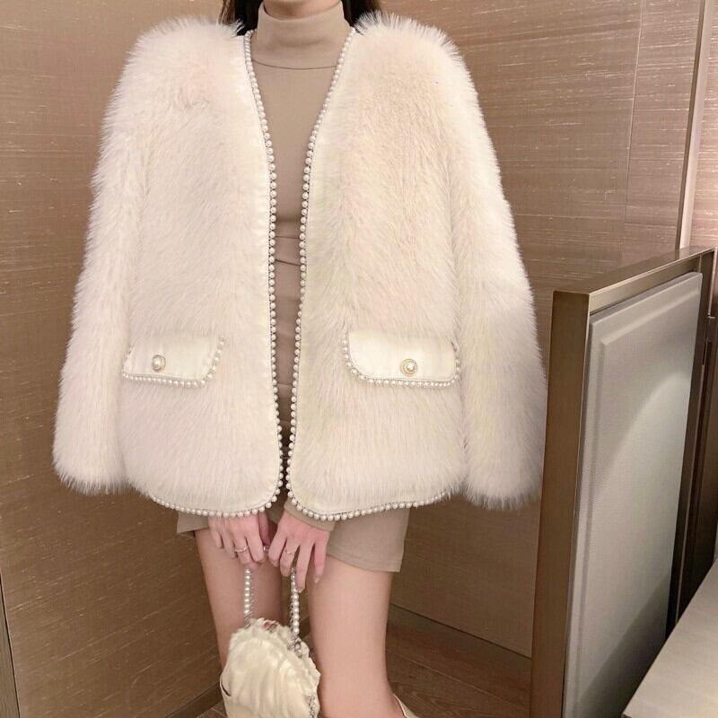 (3色選択可) アウター ジャケット フェイクファー 長袖 厚手 Vネック ポケット 大人可愛い 上品 おしゃれ 存在感 主役級 ルーズ フリーサイズ 10代 20代 30代 40代 休日 お出かけ デート 女子会 インスタ映え コーデ あったか ファッション フリーサイズ ホワイト 白 グレー 灰色 アプリコット | Chère