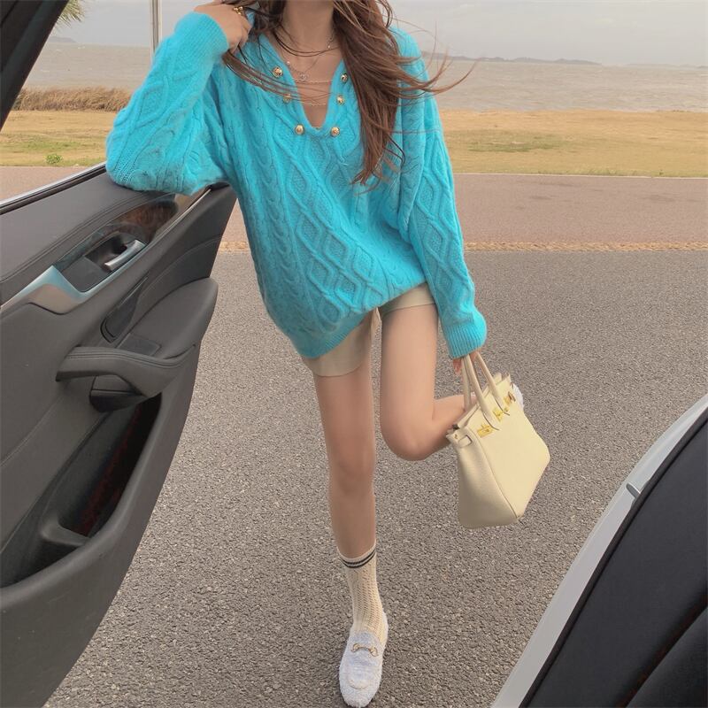 (2色選択可) トップス ニット セーター プルオーバー Vネック 長袖 チェーン ミディアム丈 カジュアル おしゃれ 大人可愛い キュート こなれ感 ルーズ フリーサイズ 10代 20代 30代 40代 普段使い 休日 お出かけ デート 女子会 モテ コーデ スタイル 韓国系 ファッション ホワイト 白 ブルー 青 | Chère