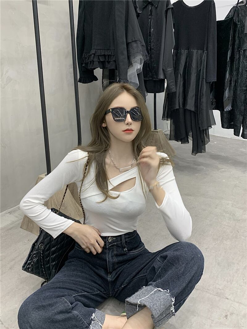 (2色選択可) トップス インナー Tシャツ ショート丈 長袖 ローネック スリム シンプル カジュアル 大人可愛い おしゃれ セクシー 10代 20代 30代 40代 普段使い 普段着 休日 お出かけ 着回し 韓国系 ファッション スタイル モテ コーデ フリーサイズ 無地 ブラック 黒 ホワイト 白 | Chère
