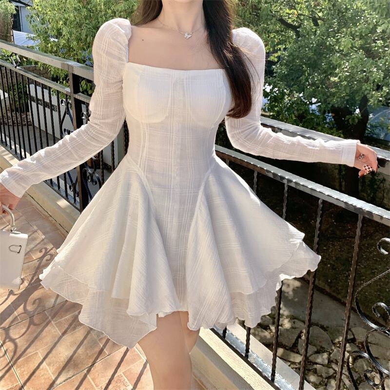 (色とサイズが選択可) ワンピース ティアードワンピース フレアワンピース ミニワンピース ミニ丈 チェック柄 透け感 スクエアネック 長袖 細身 スリム レディース 可愛い きれいめ シンプル カジュアル 大人 かわいい おしゃれ お洒落 上品 フェミニン ガーリー 大人可愛い 大人女子 春 秋 10代 20代 30代 デート お出かけ 女子会 デイリー 普段着 ブラック 黒色 ホワイト 白色 | Chère