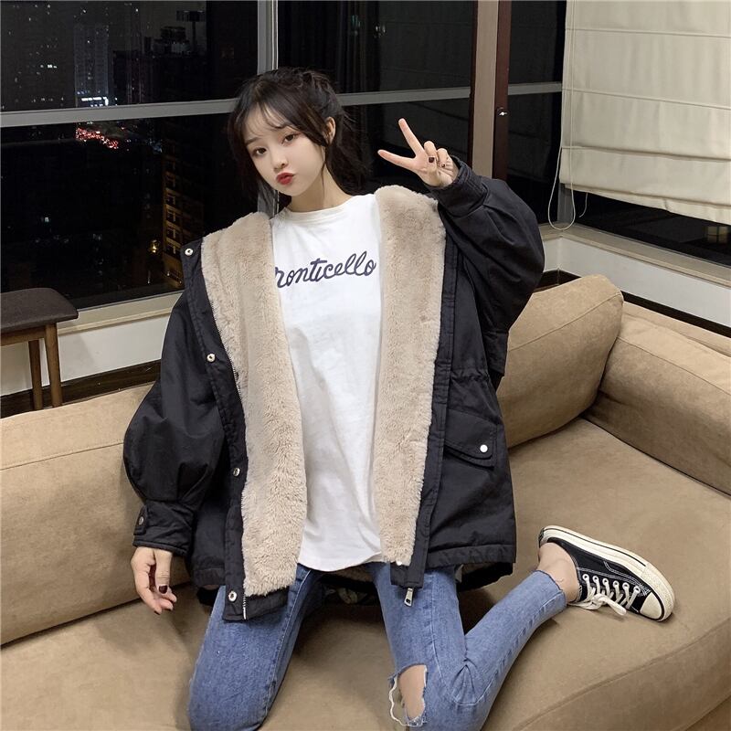 (2色選択可) アウター ジャケット ミディアム丈 フード付き ジッパー ポケット 長袖 厚手 もこもこ ボタン シンプル カジュアル ストリート系 かわいい おしゃれ こなれ感 ボーイッシュ ルーズ 大人可愛い 10代 20代 30代 40代 普段使い 休日 お出かけ アウトドア 旅行 デート 女子会 あったか コーデ 暖かい スタイル 韓国系 ファッション フリーサイズ カーキ ブラック 黒 | Chère
