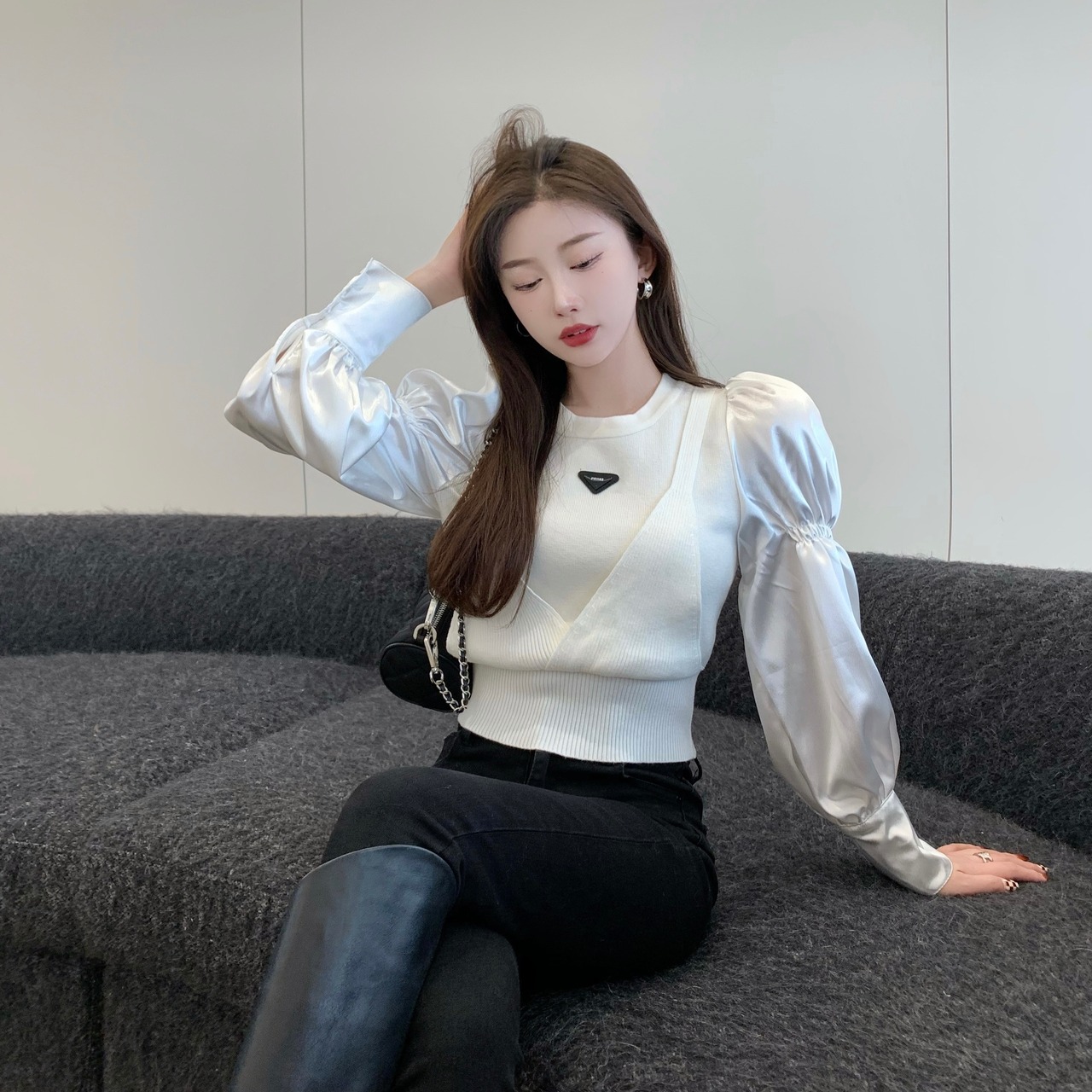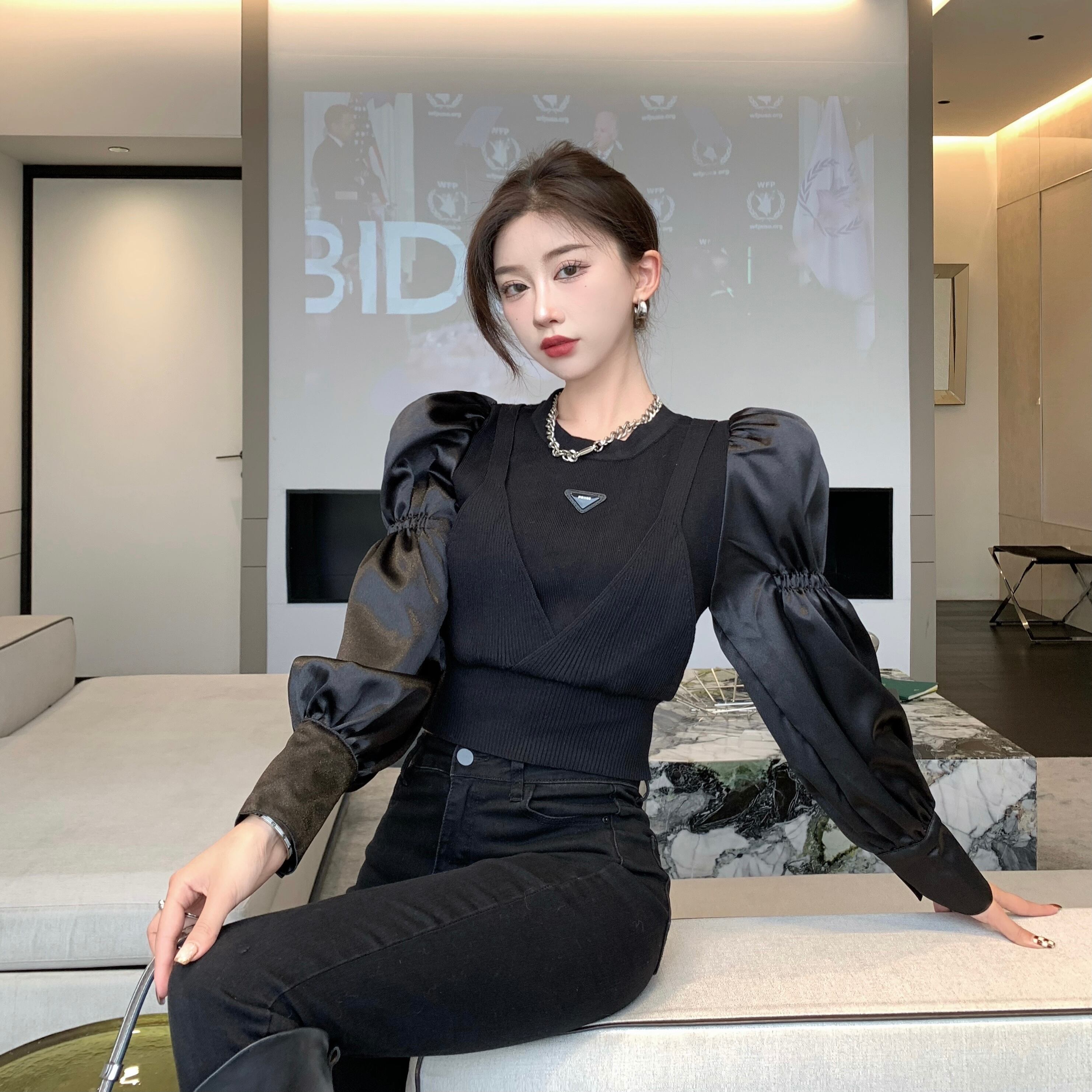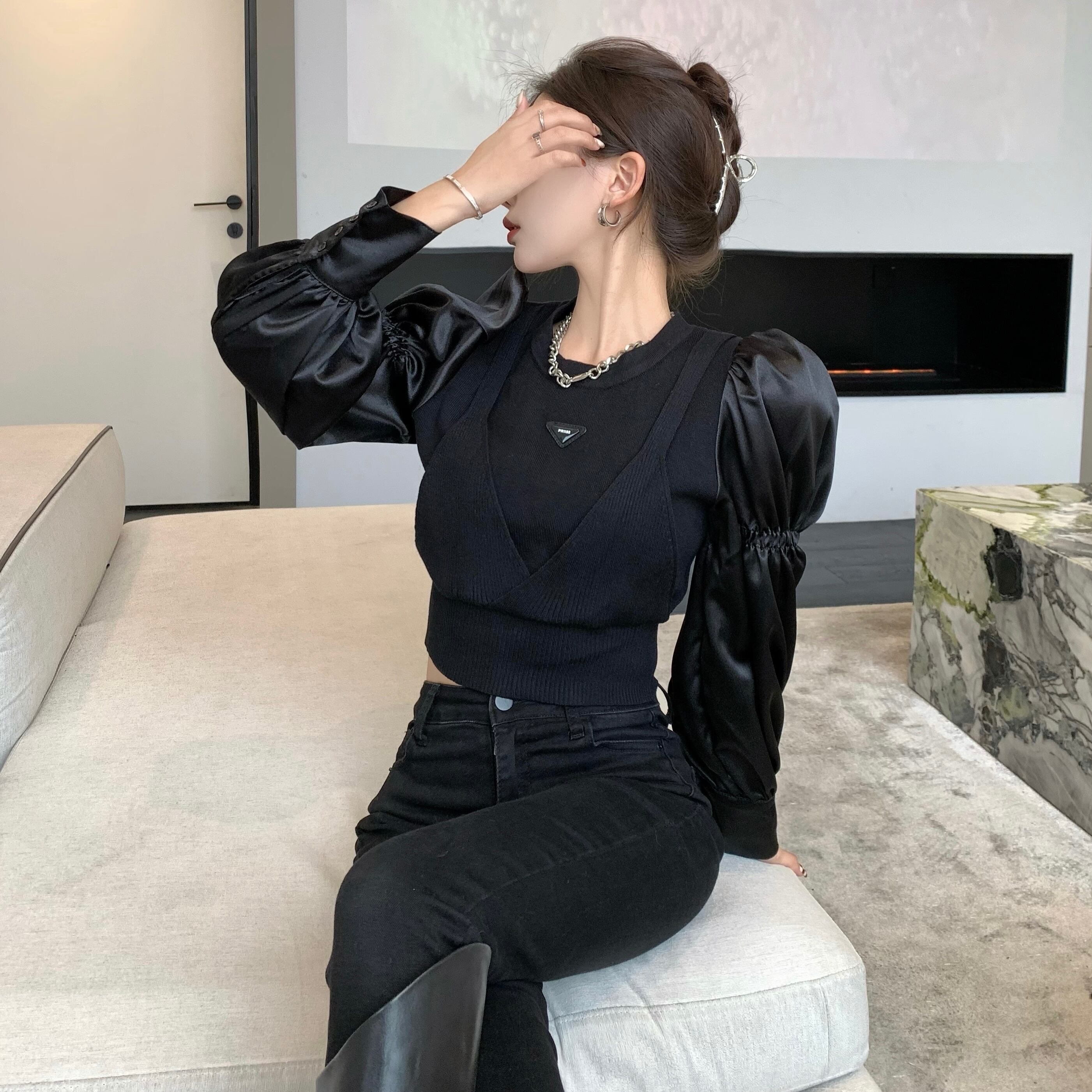 (2色選択可) トップス プルオーバー ニット 異素材切替 重ね着風 フェイクレイヤード ショート丈 ラウンドネック 肩ギャザー 長袖 パフスリーブ 無地 細身 レディース 可愛い きれいめ シンプル カジュアル 大人 かわいい おしゃれ お洒落 上品 フェミニン 大人可愛い 大人女子 春 秋 冬 10代 20代 30代 デート お出かけ 女子会 デイリー 普段着 ブラック 黒色 ホワイト 白色 | Chère