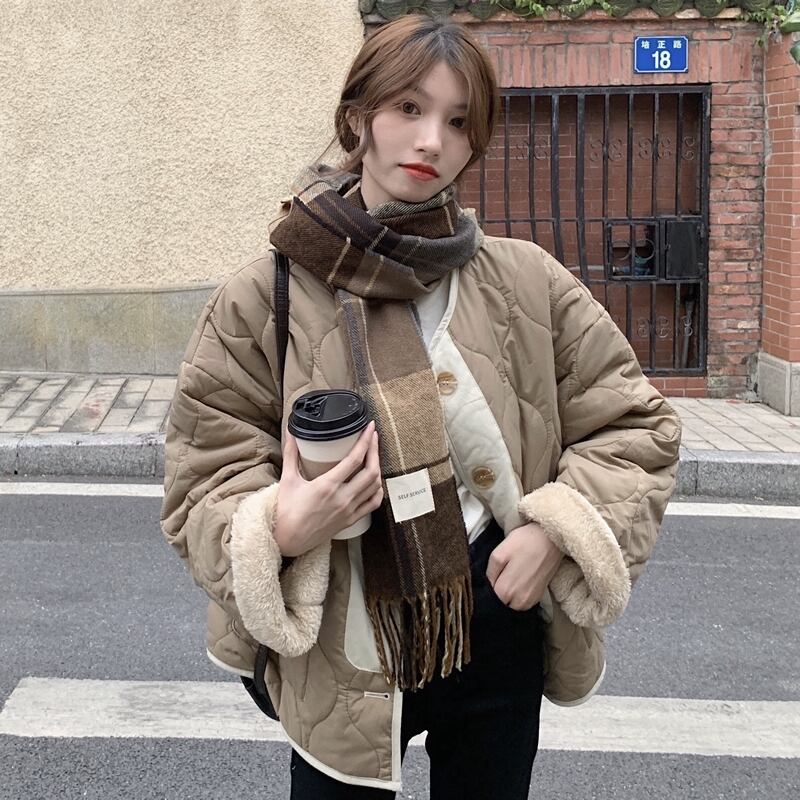 (3色選択可) アウター ジャケット ダウン 羽毛 防寒 フェイクファー ボア裏地 ノーカラー ワンポイント フード付き かわいい 大人可愛い きれいめ 上品 おしゃれ お洒落 大人女子 こなれ感 ラブリー キュート エレガント モダン 主役級 存在感 チェック柄 春 冬 10代 20代 30代 40代 オフィス OL 通勤 学生 通学 デート お出かけ 高原 ホテル ガーデン レストラン 着回し 重ね着 オルチャン モテ 定番 プチプラ 激安 トレンド 流行 インスタ映え ベージュ グレー ホワイト | Chère
