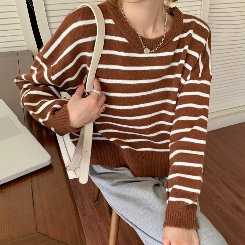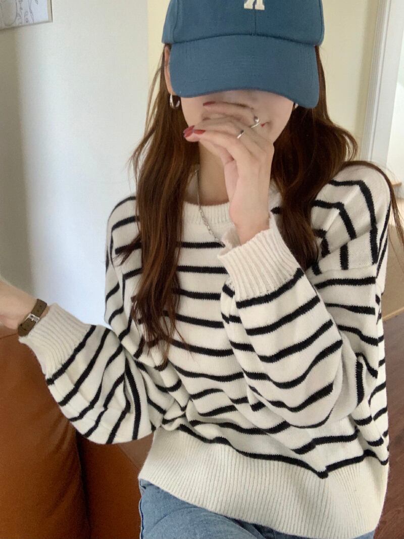 (2色選択可) ニットセーター プルオーバー ショート丈 クロップ丈 クルーネック トップス ボタン ボーダー バックコンシャス ウールタッチ リブニット スリット バイカラー 長袖 セクシー オーバーサイズ ビッグシルエット レディース 可愛い きれいめ シンプル カジュアル 大人 おしゃれ お洒落 上品 フェミニン 大人可愛い 大人女子 春 秋 冬 10代 20代 30代 40代 デート お出かけ 女子会 通勤 OL オフィス デイリー 普段着 | Chère