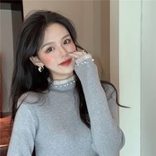 (5色選択可) トップス セーター リブニット 長袖 スリム ハイネック ニュアンスカラー レイヤード フェイクレイヤード フリル パール チュール シフォン レース シンプル かわいい カジュアル キュート ガーリー 大人可愛い おしゃれ こなれ感 10代 20代 30代 40代 普段使い 休日 女子会 デート お出かけ モテ コーデ ファッション 無地 | Chère