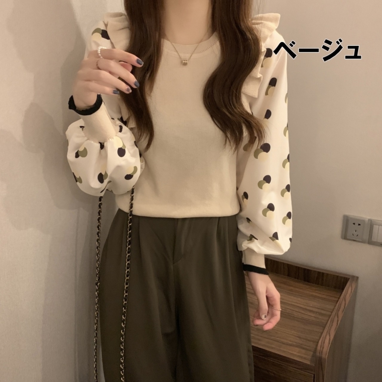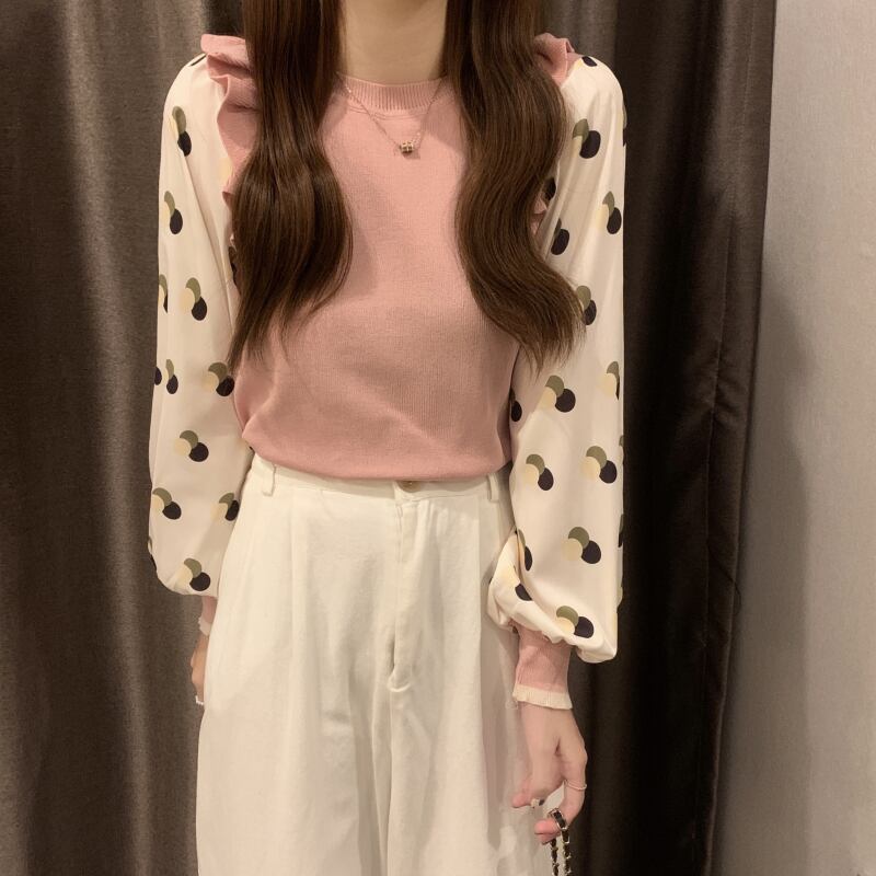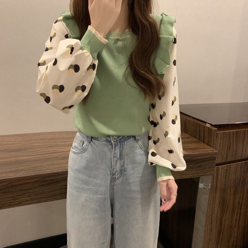 (5色選択可) トップス プルオーバー ニット フェイクレイヤード 異素材切替 重ね着風 フェイクレイヤード ショート丈 ドット 水玉 フリル リブニット 幾何学 クルーネック 肩ギャザー 長袖 パフスリーブ 無地 細身 レディース 可愛い きれいめ シンプル カジュアル 大人 かわいい おしゃれ お洒落 上品 フェミニン 大人可愛い 大人女子 春 秋 冬 10代 20代 30代 デート お出かけ 女子会 デイリー 普段着 | Chère