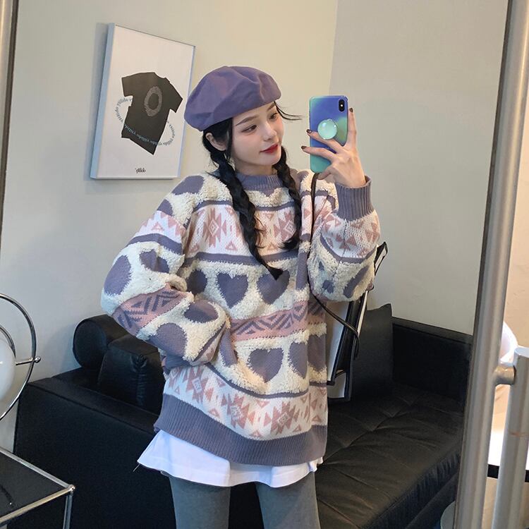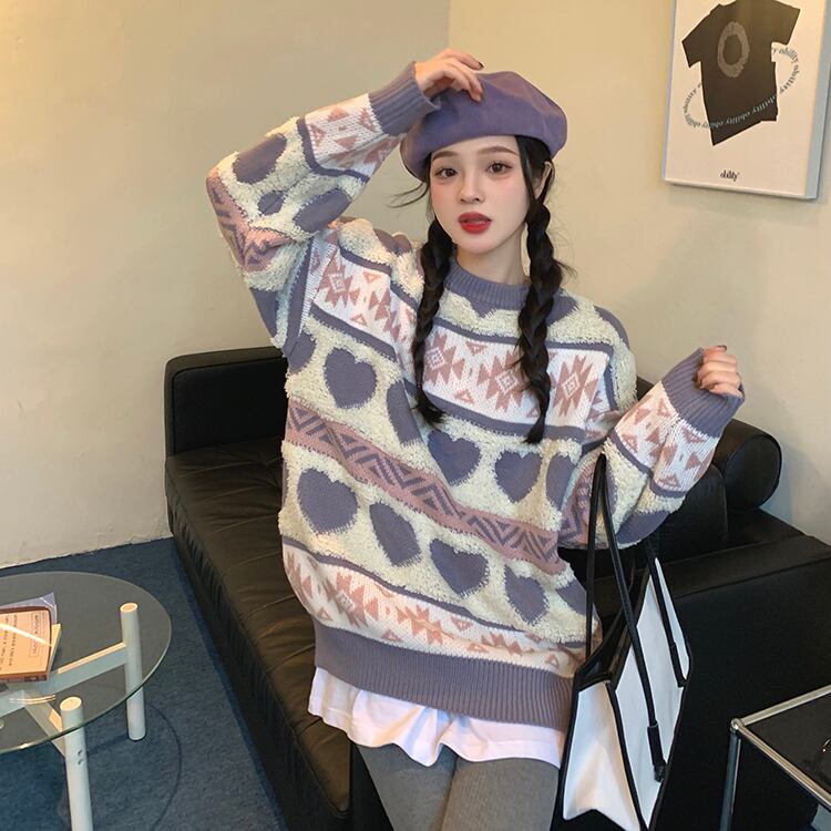 (2色選択可) トップス セーター レディース 長袖 幾何学柄 ハート 柄 普段使い 韓国 オルチャン 楽ちん あったか 暖かい モテ 体系カバー 通勤 通学 デート お出かけ 公園デビュー 女子会 お泊まり 休日 10代 20代 30代 40代 レディース ママ マタニティ かわいい 大人可愛い レトロ 大人可愛い ラフ ラブリー キュート ガーリー ルーズ 個性的 フリーサイズ 大きい 大きめ ビッグサイズ ゆったり ゆる ブルー パープル パステルカラー くすみカラー 大人カラー 春カラー 秋カラー | Chère