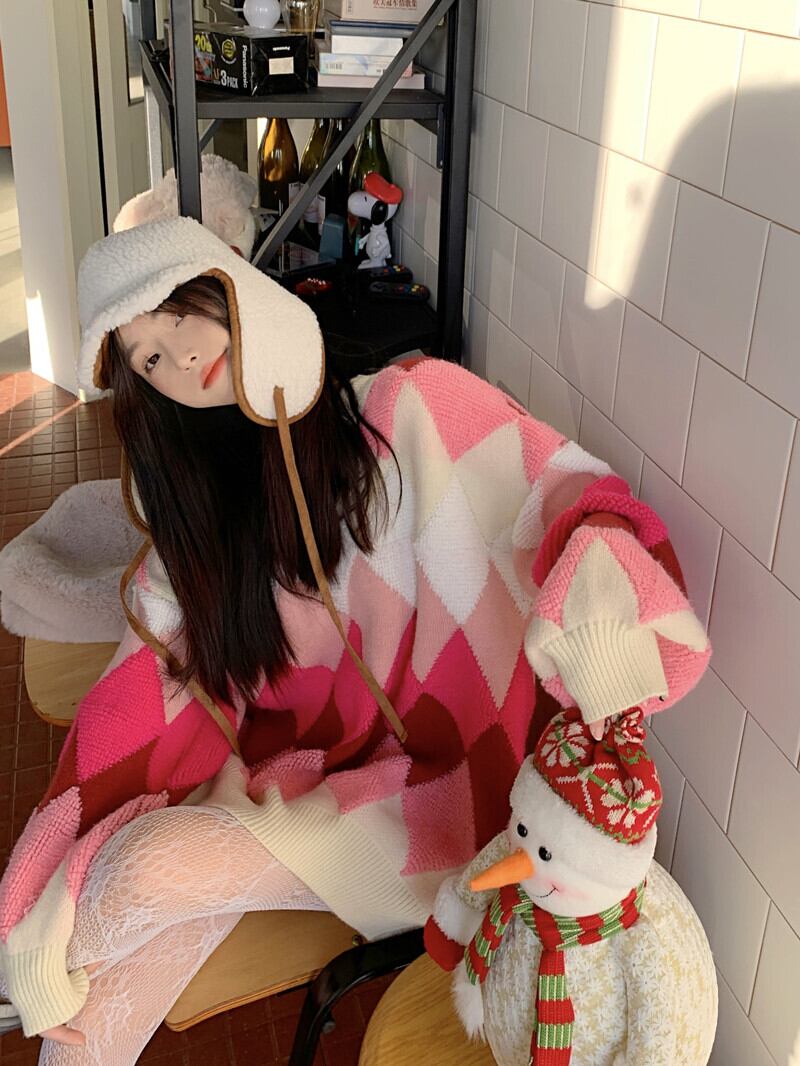 グラデーション配色のダイヤチェック柄が大人可愛いニットセーター。