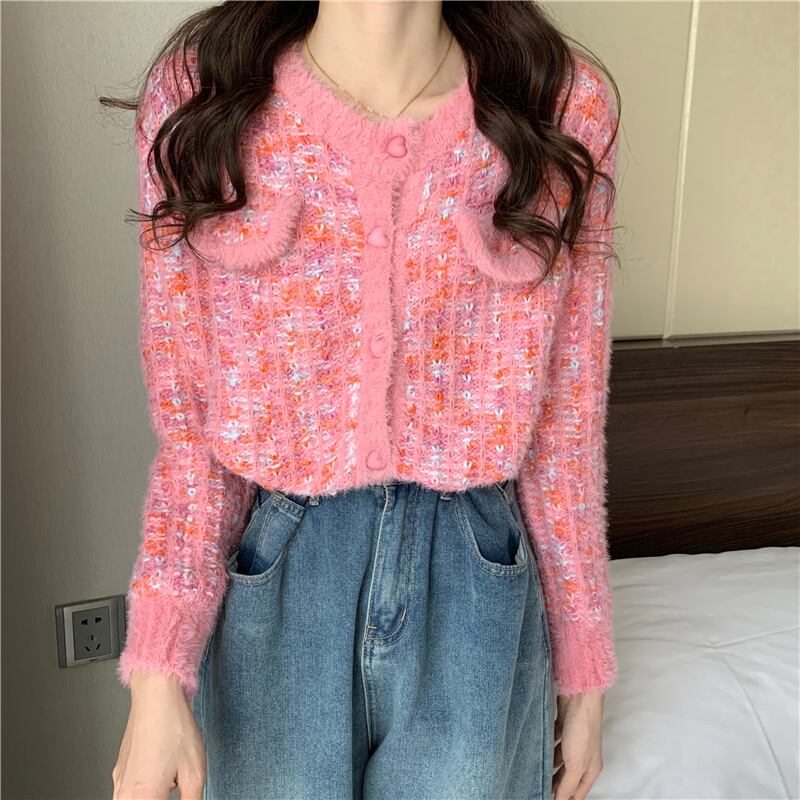 (2色選択可) カーディガン ニットカーディガン チェック柄 モヘアニット シャギーニット 羽織り ショート丈 前開き ラウンドネック 長袖 ゆったり レディース 可愛い きれいめ シンプル カジュアル 大人 かわいい おしゃれ お洒落 上品 フェミニン 大人可愛い 大人女子 春 秋 冬 10代 20代 30代 40代 デート お出かけ 女子会 通勤 OL オフィス デイリー 普段着 ピンク パープル 紫色 | Chère