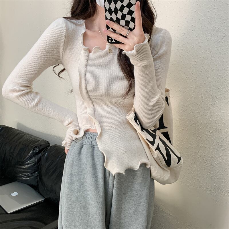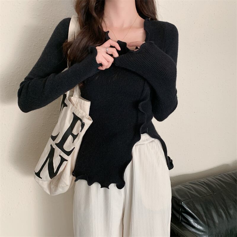 (2色選択可) セーター ニットセーター フリル 不規則 アシンメトリー プルオーバー トップス ショート丈 リブニット リブ編み 長袖 無地 細身 スリム レディース 可愛い きれいめ シンプル カジュアル 大人 かわいい おしゃれ お洒落 上品 フェミニン 大人可愛い 大人女子 春 秋 冬 10代 20代 30代 40代 デート お出かけ 女子会 デイリー 普段着 ベージュ ブラック 黒色 | Chère
