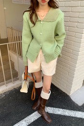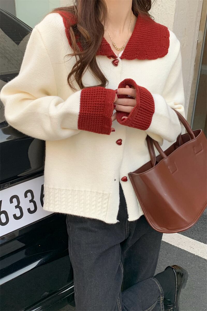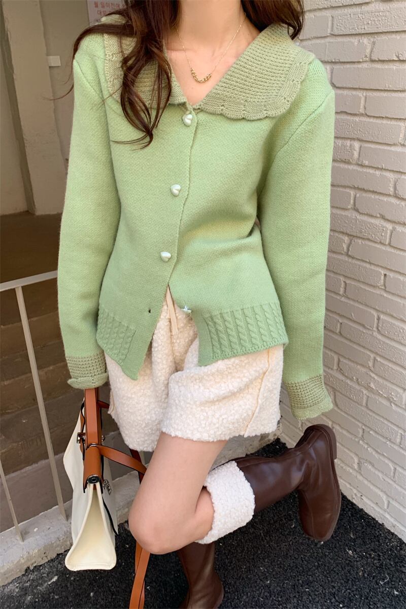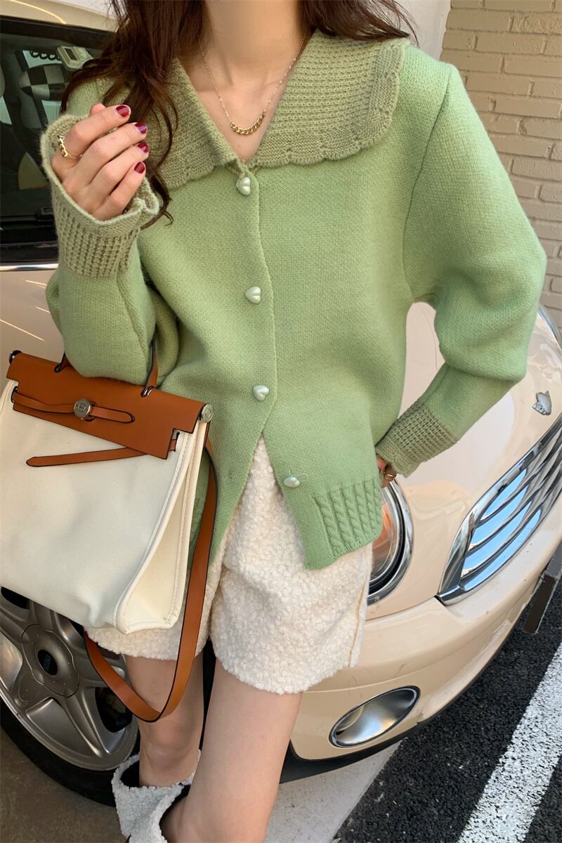 大きめの襟とハートボタンがガーリーで大人可愛いニットカーディガン。