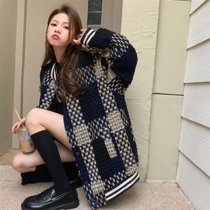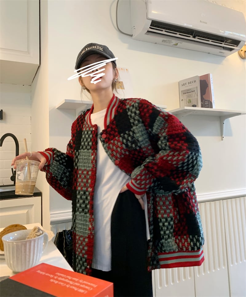 (2色選択可) アウター ジャケット スタジャン 長袖 厚手 ボタン 前開き スタンドカラー ミディアム丈 ミドル丈 ルーズ カジュアル レトロ シック ストリート系 かわいい かっこいい おしゃれ ボーイッシュ マニッシュ メンズライク お洒落 こなれ感 フリーサイズ 10代 20代 30代 40代 普段使い 休日 お出かけ デート 女子会 学生 韓国 韓国系 ファッション モテ インスタ映え コーデ スタイル 秋 冬 柄 チェック柄 レッド 赤 ブラック 黒 | Chère