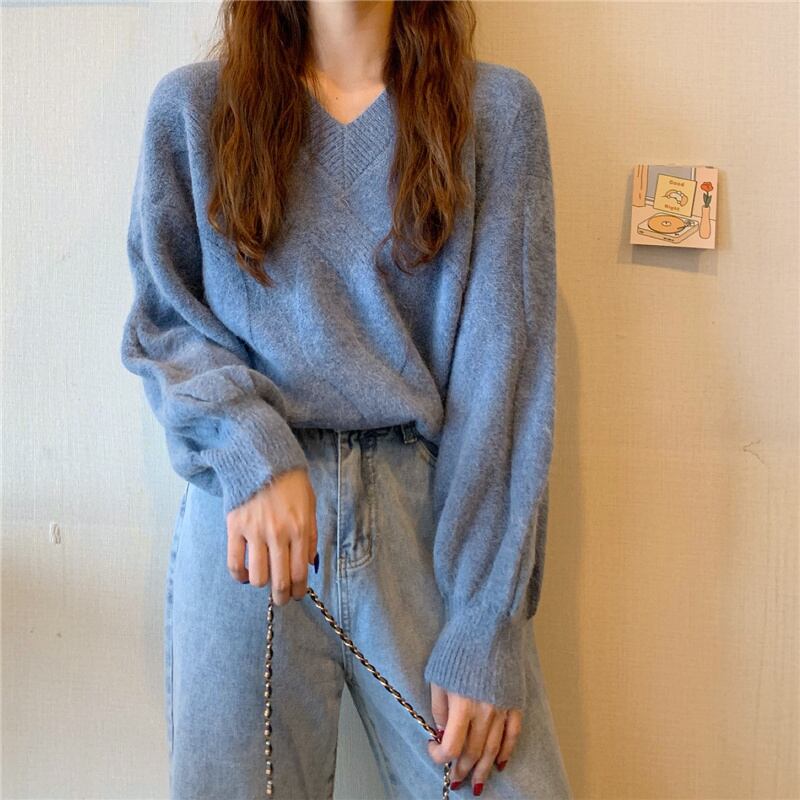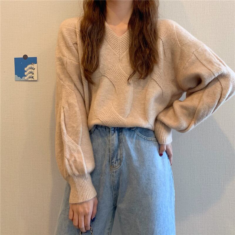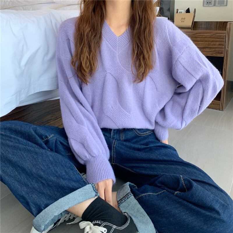 (5色選択可) トップス ニット セーター プルオーバー 長袖 Vネック 厚手 ランタンスリーブ ルーズ カジュアル シンプル かわいい おしゃれ こなれ感 お洒落 大人カジュアル 大人女子 お洒落 大人可愛い 抜け感 ラフカジュアル フリーサイズ 10代 20代 30代 40代 学生 OL ママ 休日 お出かけ 女子会 デート 普段使い 普段着 デイリー あったか コーデ 暖かい モテ 韓国系 ファッション 秋 冬 無地 カラバリ アプリコット グレー 灰色 パープル 紫 ブルー 青 イエロー 黄色 | Chère
