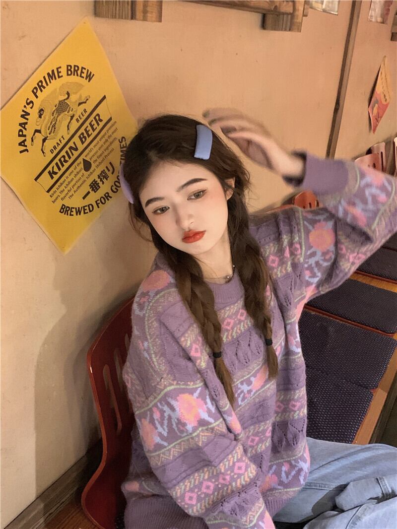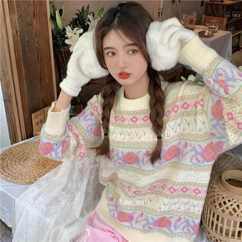 (2色選択可) トップス ニット セーター 花柄 幾何学 ローズ 薔薇 透かし編み シースルー レトロ 長袖 ラウンドネック クルーネック 厚手 ルーズ カジュアル シンプル おしゃれ かわいい 大人女子 大人カジュアル お洒落 大人可愛い こなれ感 ラフカジュアル 抜け感 フリーサイズ 10代 20代 30代 40代 学生 OL ママ 通勤 通学 普段使い 普段着 デイリー 休日 お出かけ デート 女子会 モテ コーデ 韓国系 ファッション 秋 冬 無地 | Chère